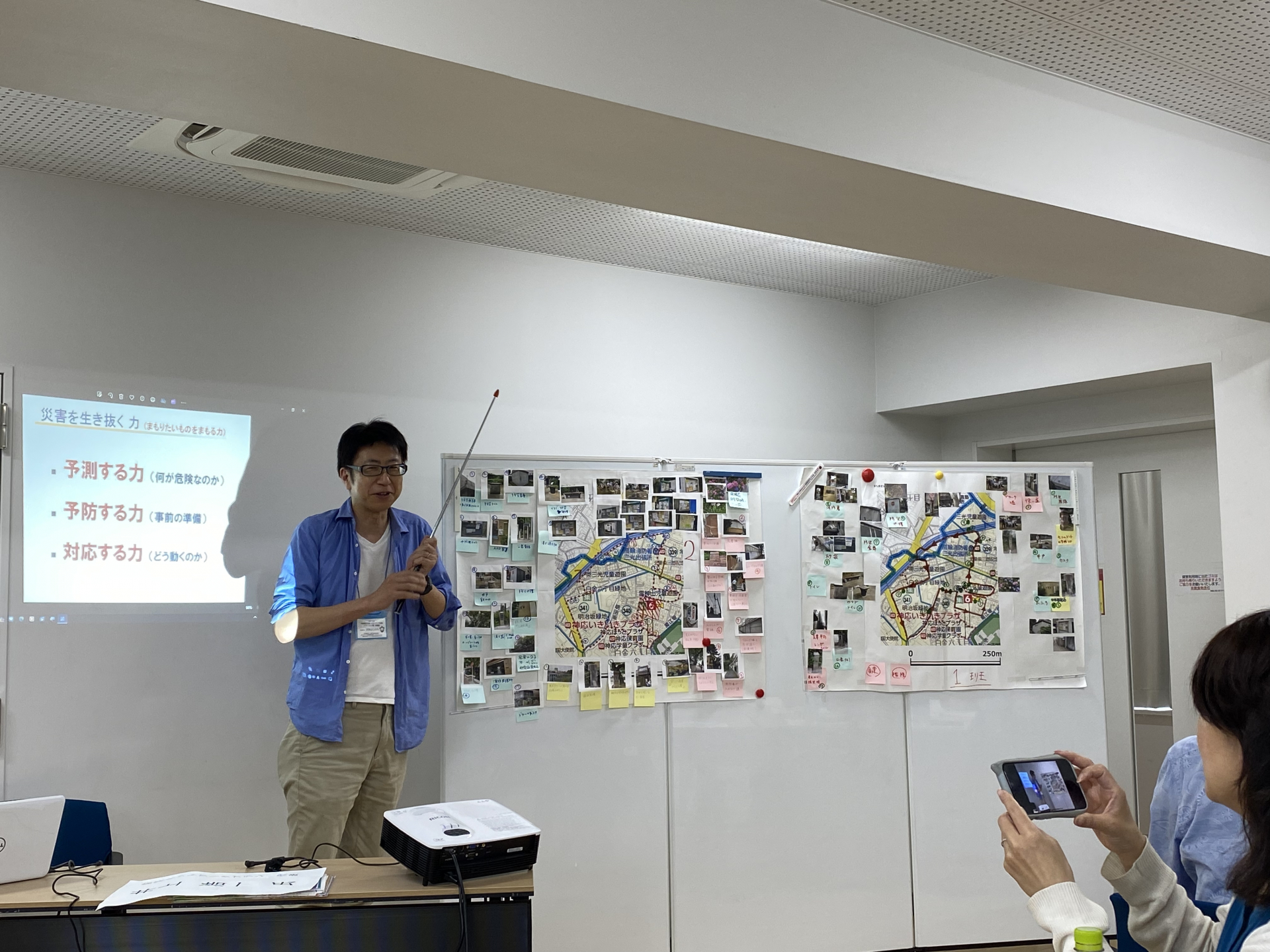 まずは、30分ほどの座学がありました。防災ネットワークプラン代表の井上浩一氏によるお話しで、災害に役立つマップ作りのための興味深い内容でした。市区町村が作成するマップは、公共施設中心で個人の視点はないため、自分たちの目で見て感じた「災害時のための作戦マップ」を作るという企画です。