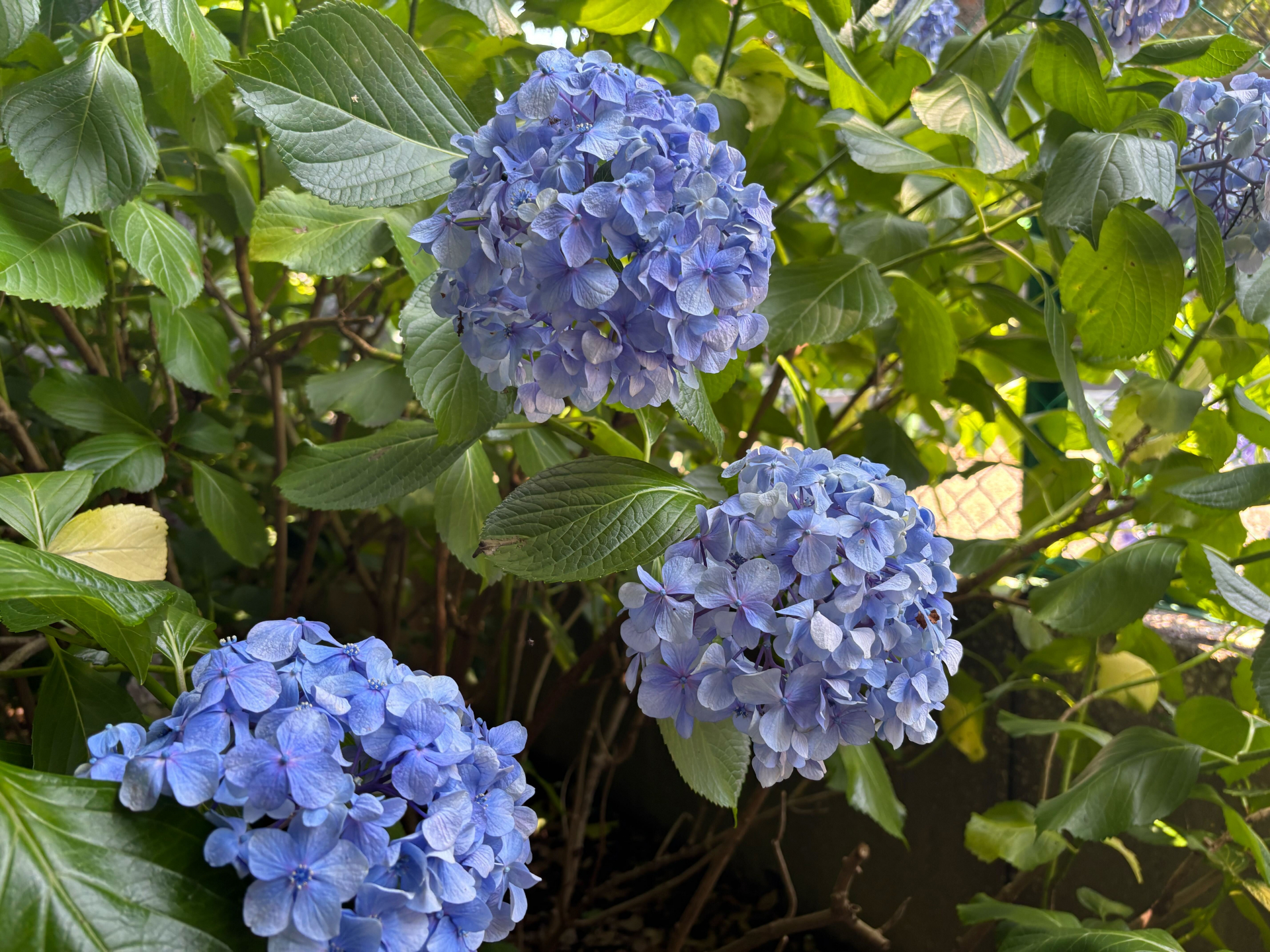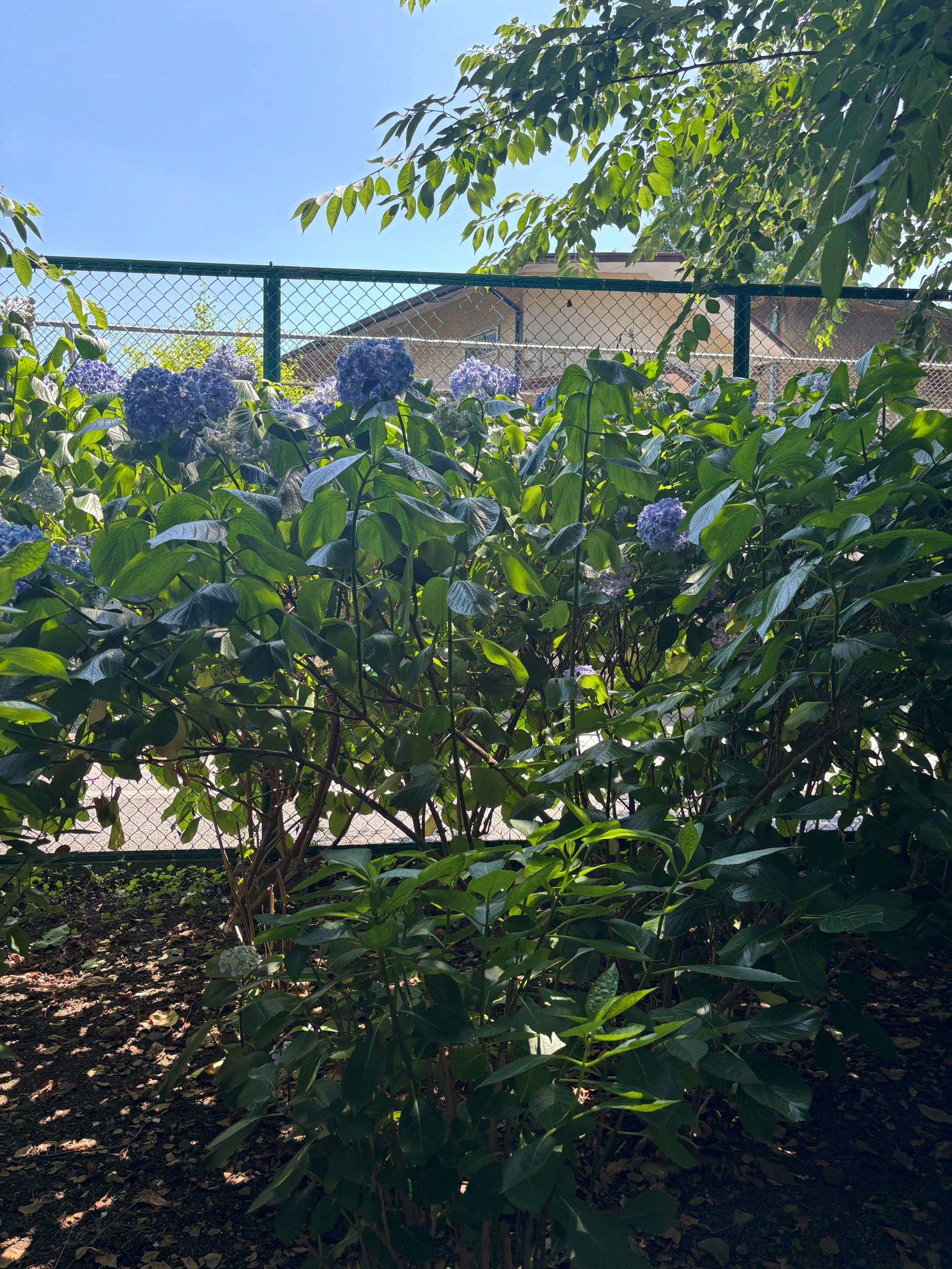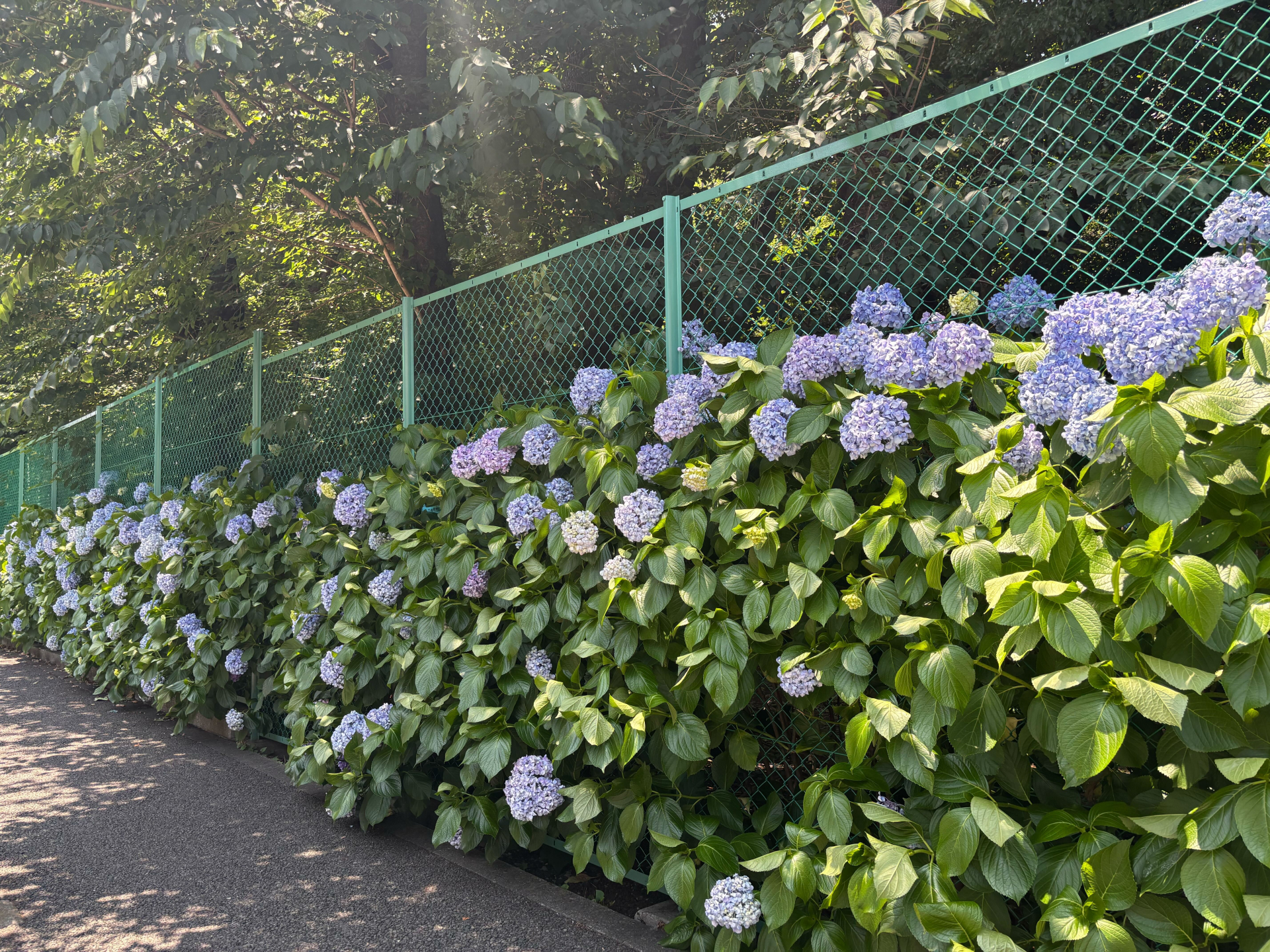 フェンスを越えそうな勢いのあじさいたち。意外と背が高く、見上げる形に。