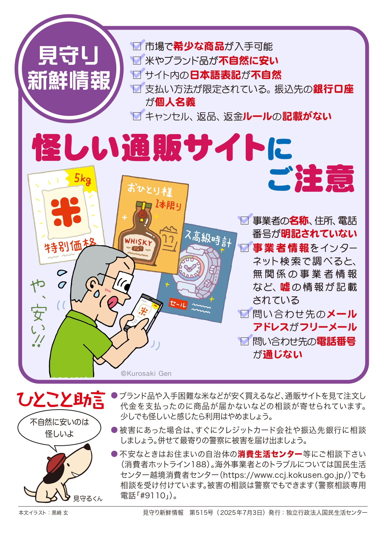 ☆ブランド品や入手困難な米などが安く買えるなど、通販サイトを見て注文し代金を支払ったのに商品が届かないなどの相談が寄せられています。少しでも怪しいと感じたら利用はやめましょう。