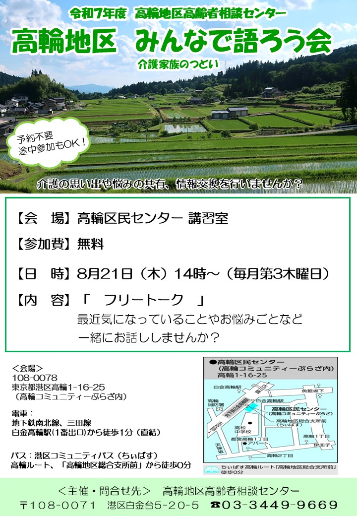 8月21日(木)14時から高輪区民センター講習室にて「高輪地区みんなで語ろう会(介護家族のつどい)を開催いたします。
