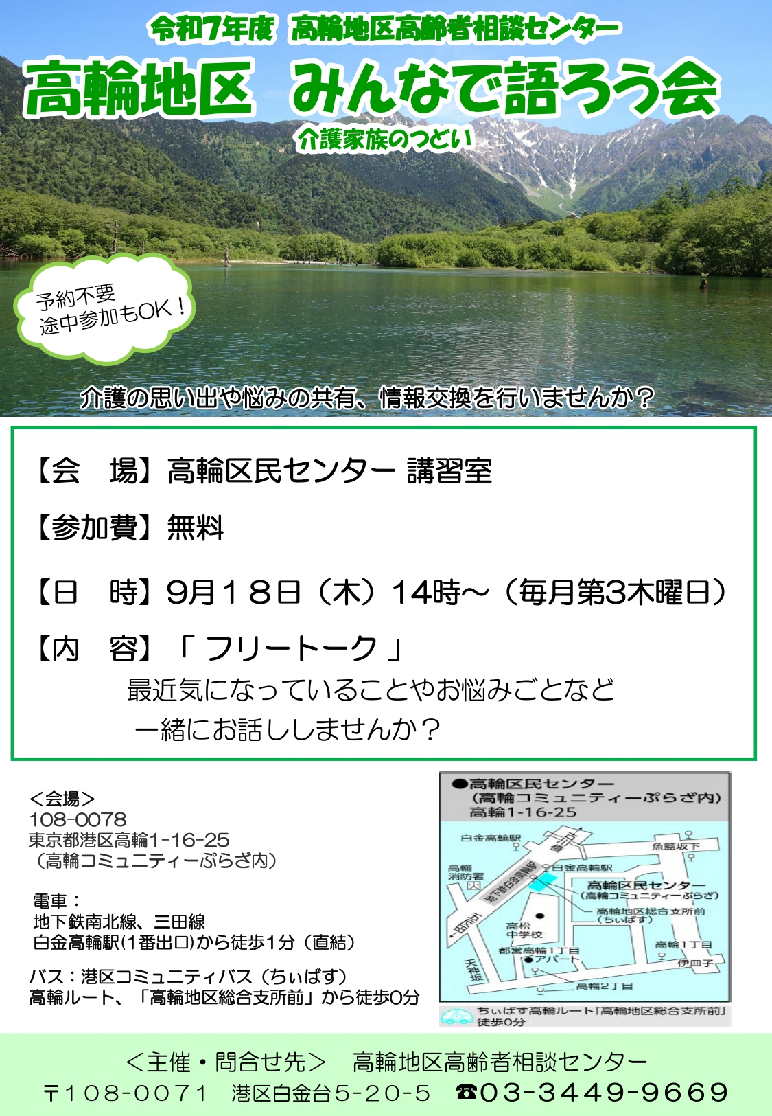 9月18日(木)14時から高輪区民センター講習室にて「高輪地区みんなで語ろう会(介護家族のつどい)を開催いたします。