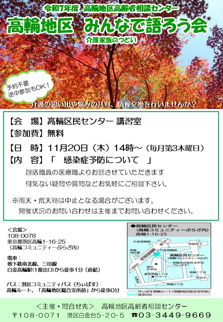 11月20日(木)14時から高輪区民センター講習室にて「高輪地区みんなで語ろう会(介護家族のつどい)を開催いたします。