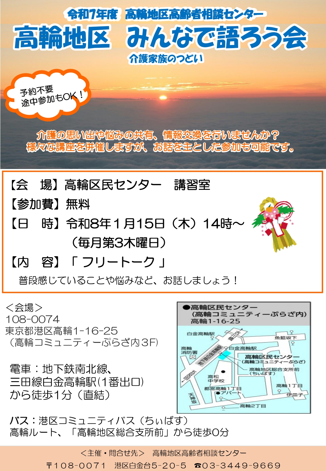 1月15日(木)14時から高輪区民センター講習室にて『高輪地区みんなで語ろう会(介護家族のつどい)』を開催いたします。
