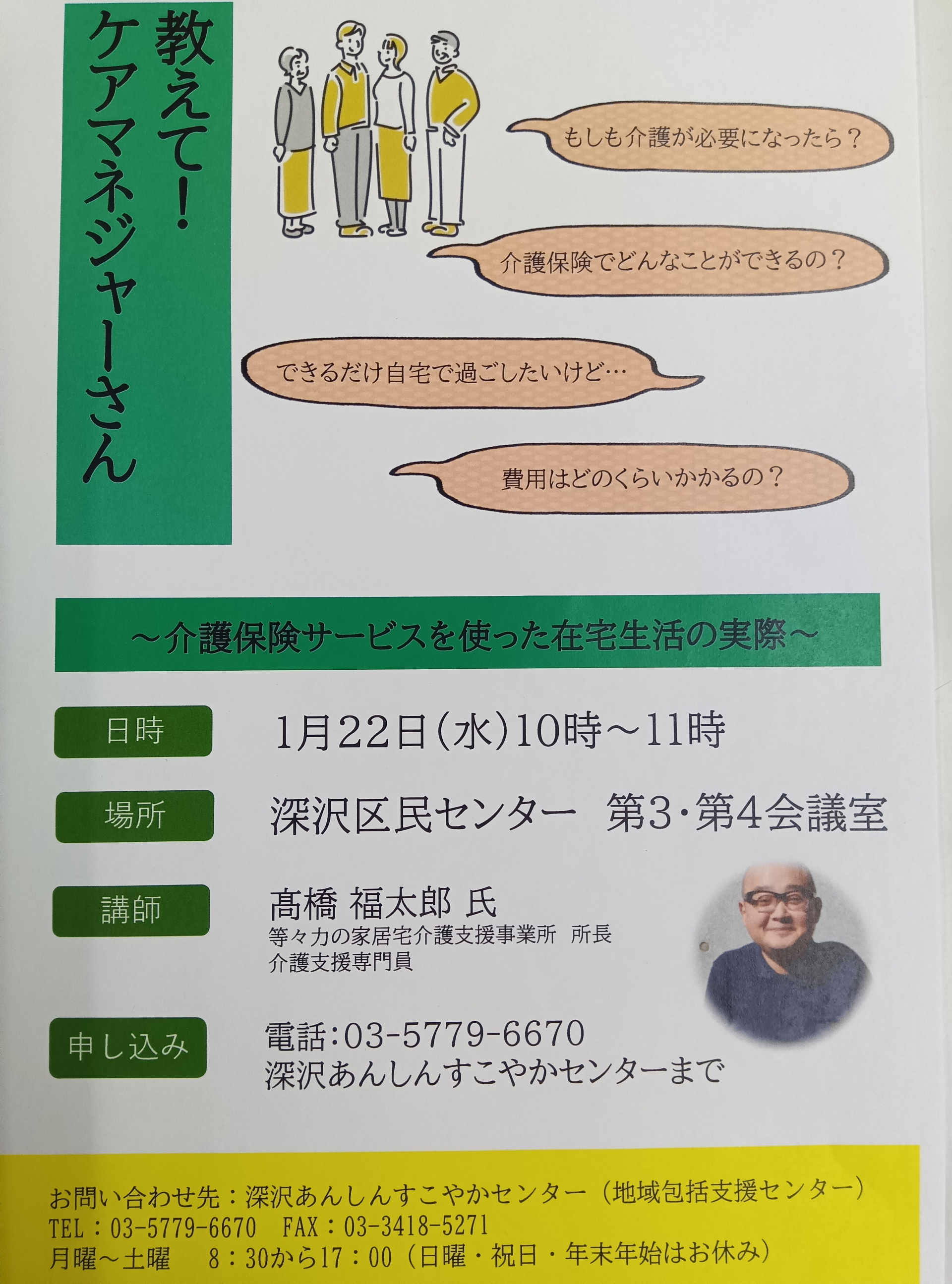 2025.01.17 お知らせ 【等々力の家居宅】「教えて!ケアマネジャーさん」のお知らせ Tweet シェアする 皆さん、こんばんは! 今回は急なお知らせですが、来週1月22日(水)の10時から、 深沢区民センターでお話をさせていただきます。 是非お越しくださいませ! 等々力の家居宅 髙橋 前の記事 2025.01.20 お知らせ 【等々力の家居宅】やすらぎがんサロンin等々力 次の記事 2025.01.16 お知らせ 【等々力の家居宅】奉優会包括事業部の新動画が完成いたしました! 一覧へ戻る