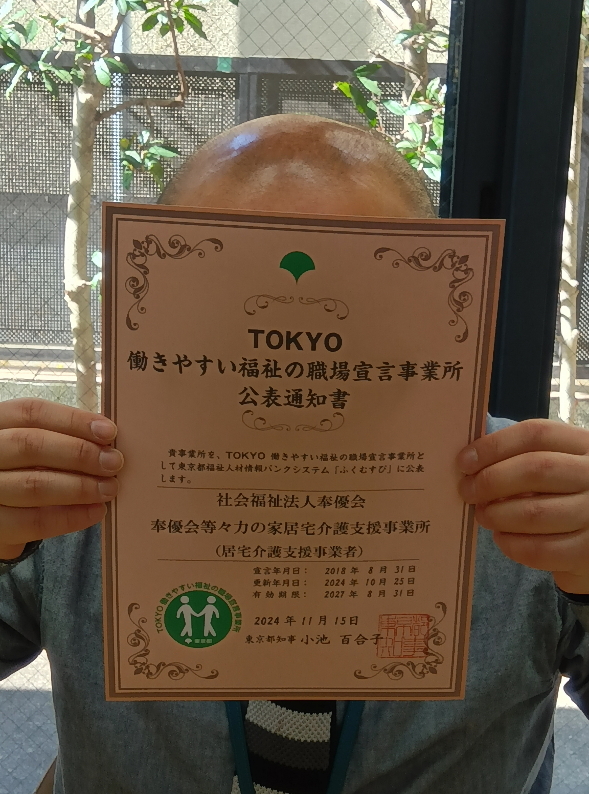 本日、東京都から「働きやすい福祉の職場宣言事業所公表通知書」が届きました。