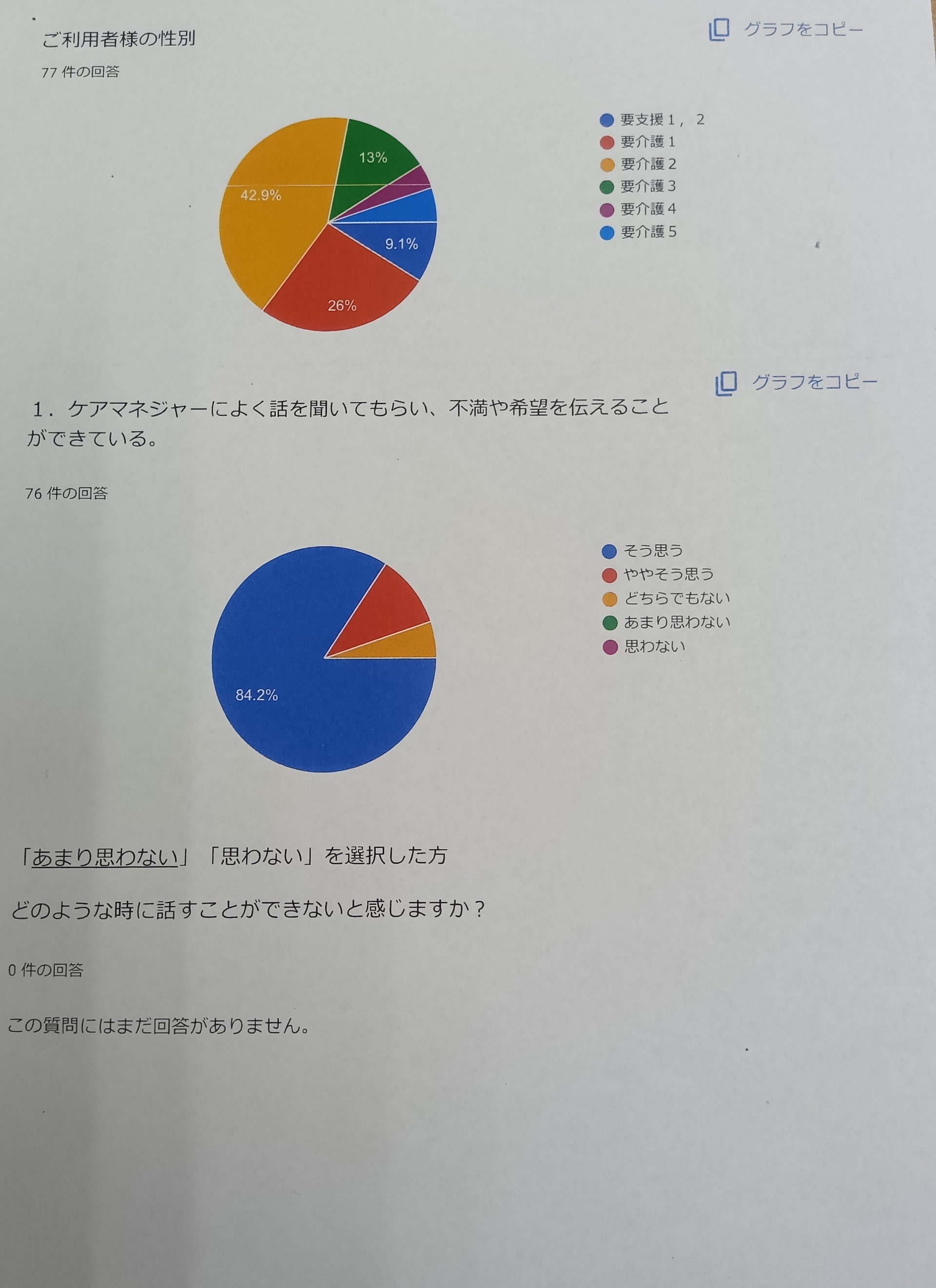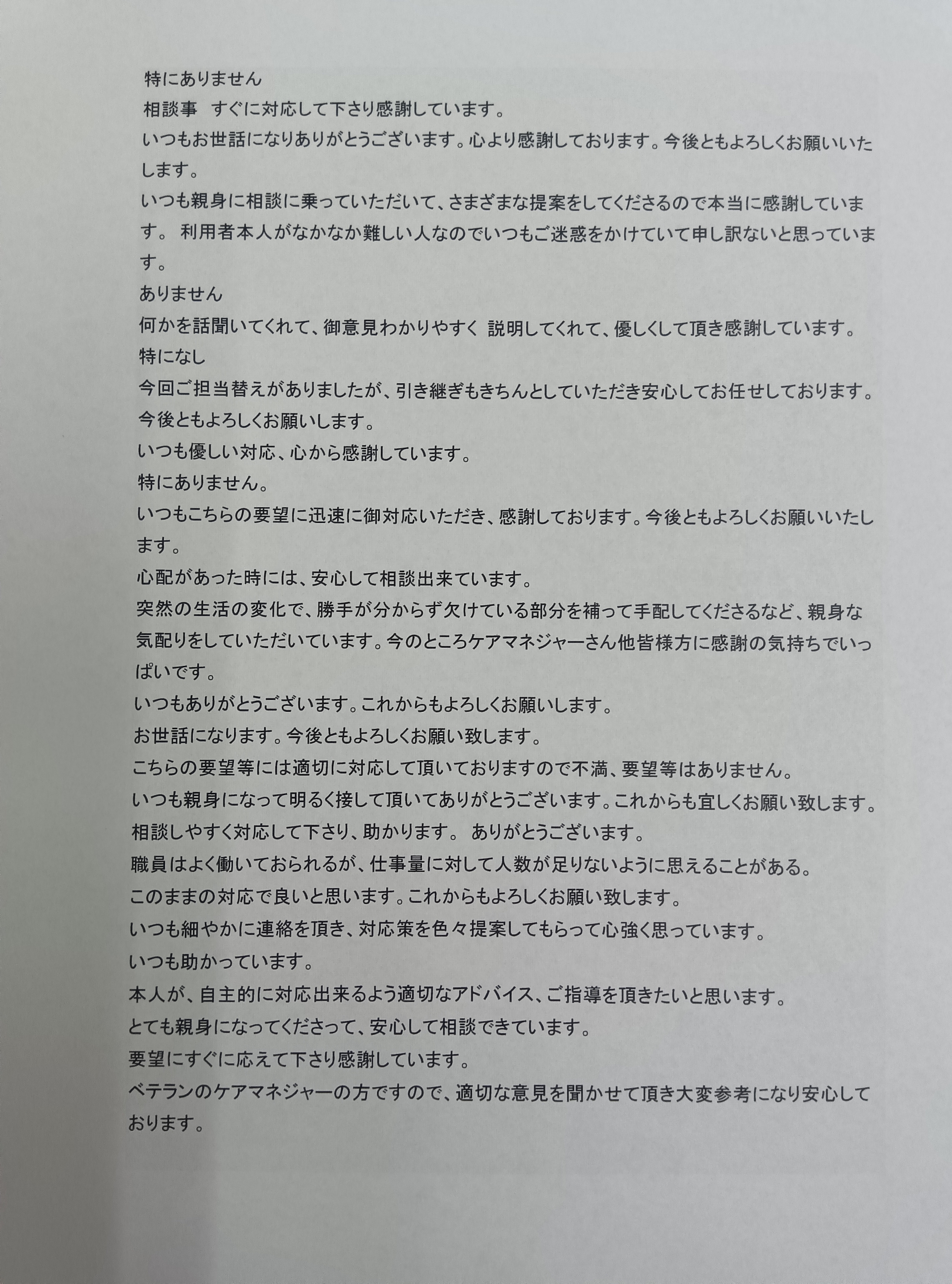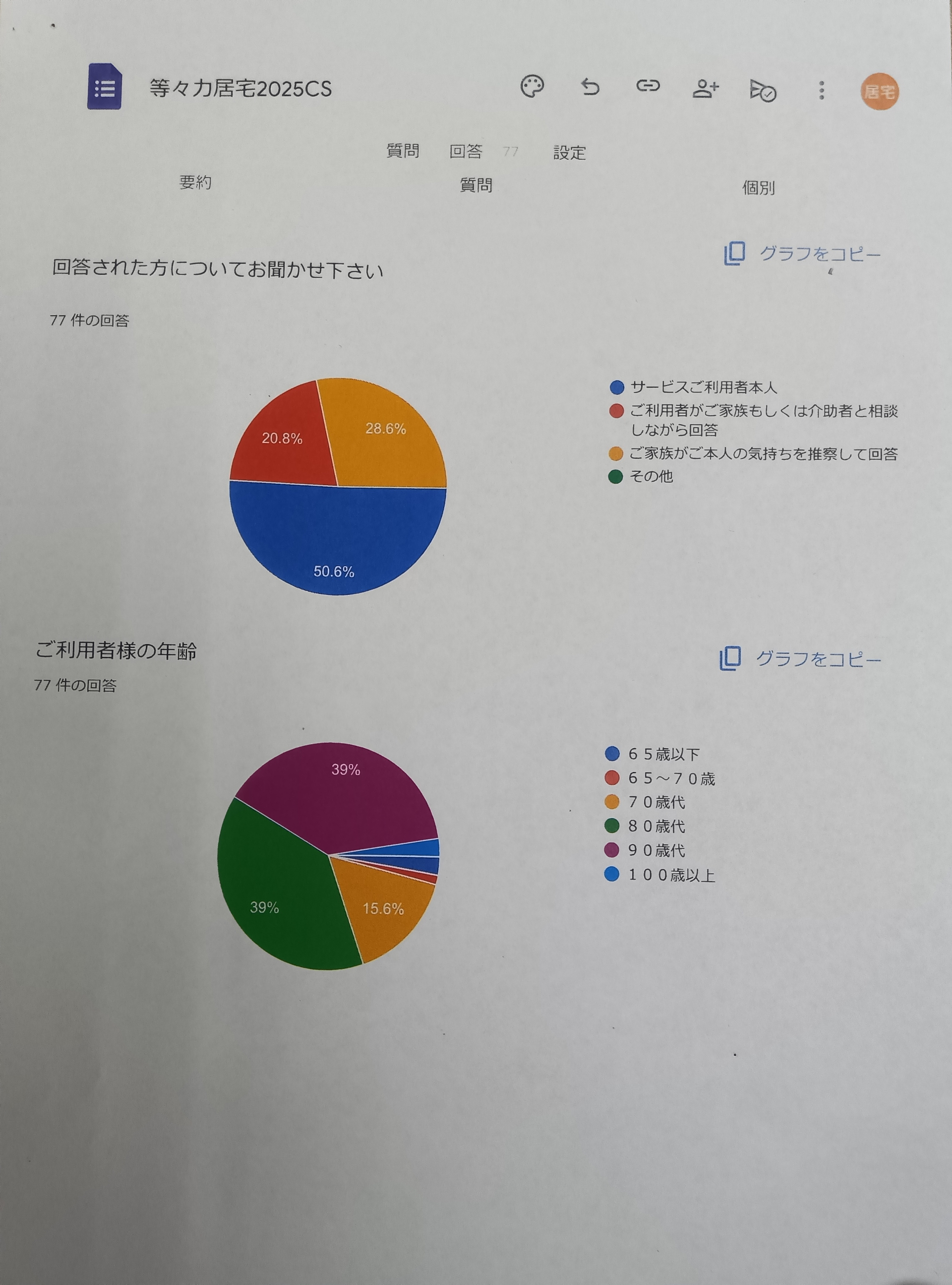 2026.01.14 活動報告 【等々力の家居宅】アンケートの結果のお知らせ Tweet シェアする 皆さん、こんにちは! 昨年、皆様にご協力いただいたアンケートの集計が完了いたしました。 皆様のお言葉を胸に今年も頑張ります! ご協力ありがとうございました! 等々力の家居宅 髙橋 前の記事 2026.01.22 活動報告 【等々力の家居宅】等々力地区多職種連絡会に参加しました! 次の記事 2026.01.13 活動報告 【等々力の家居宅】初詣に行ってまいりました! 一覧へ戻る