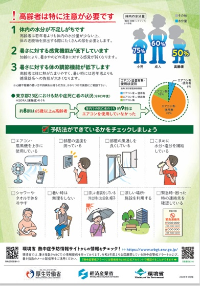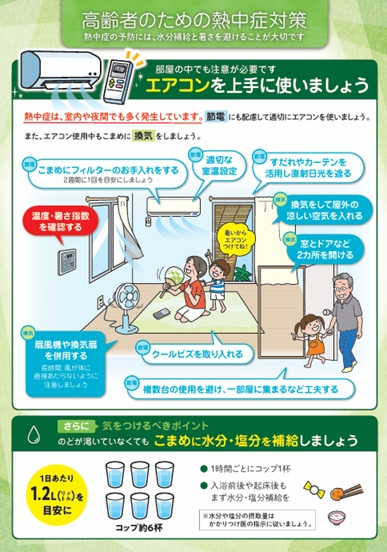 上記は厚生労働省・経済産業省・環境省連名で発行されている高齢者のための熱中症対策リーフレットです。