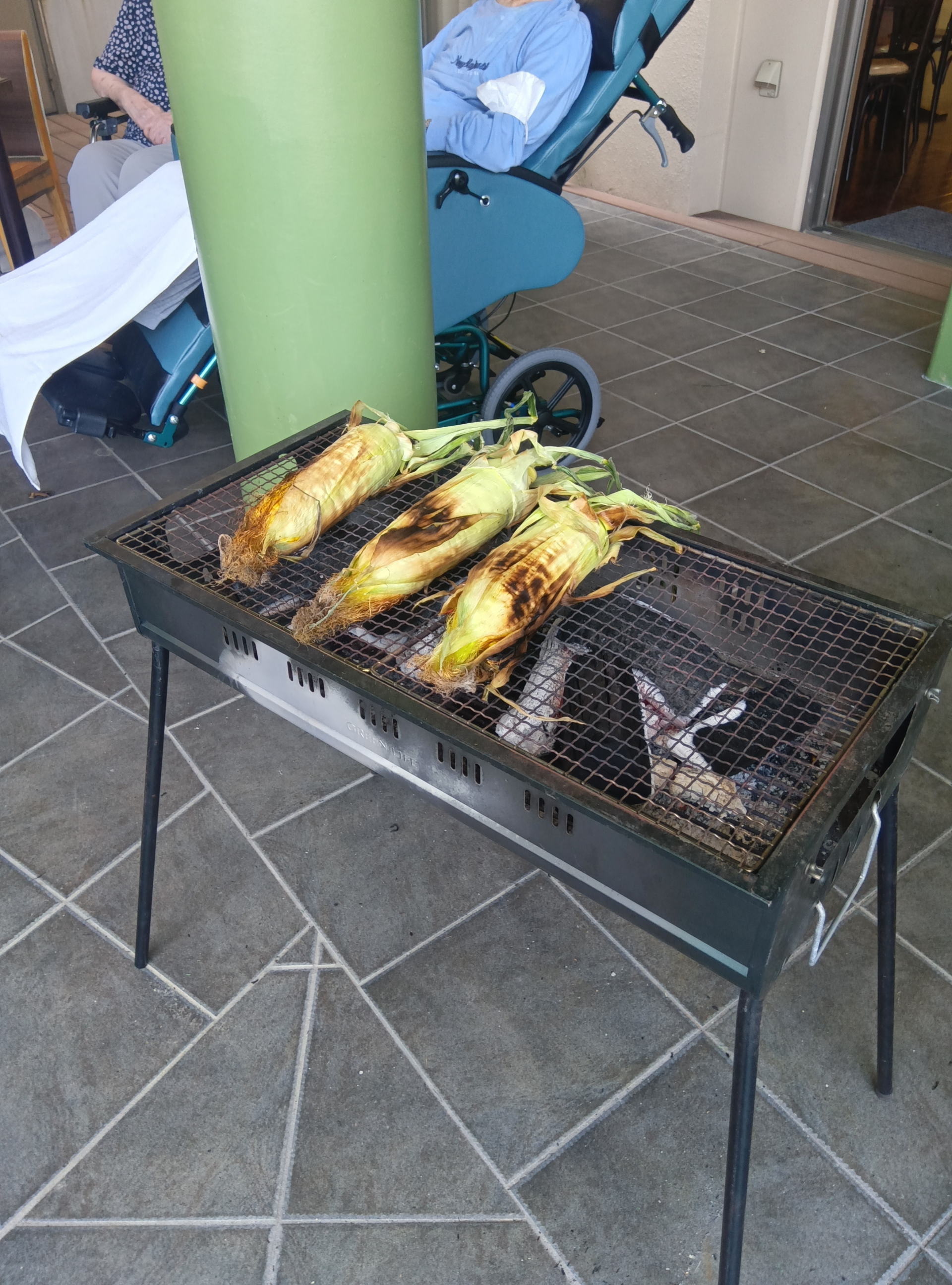 杜松特別養護老人ホームのテラスで『焼きトウモロコシ会』が開催されました。