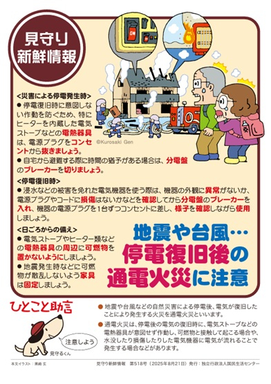 国民生活センターのホームページに地震や台風発生停電復旧後の通電火災への注意喚起の記事がございましたので、お知らせいたします。