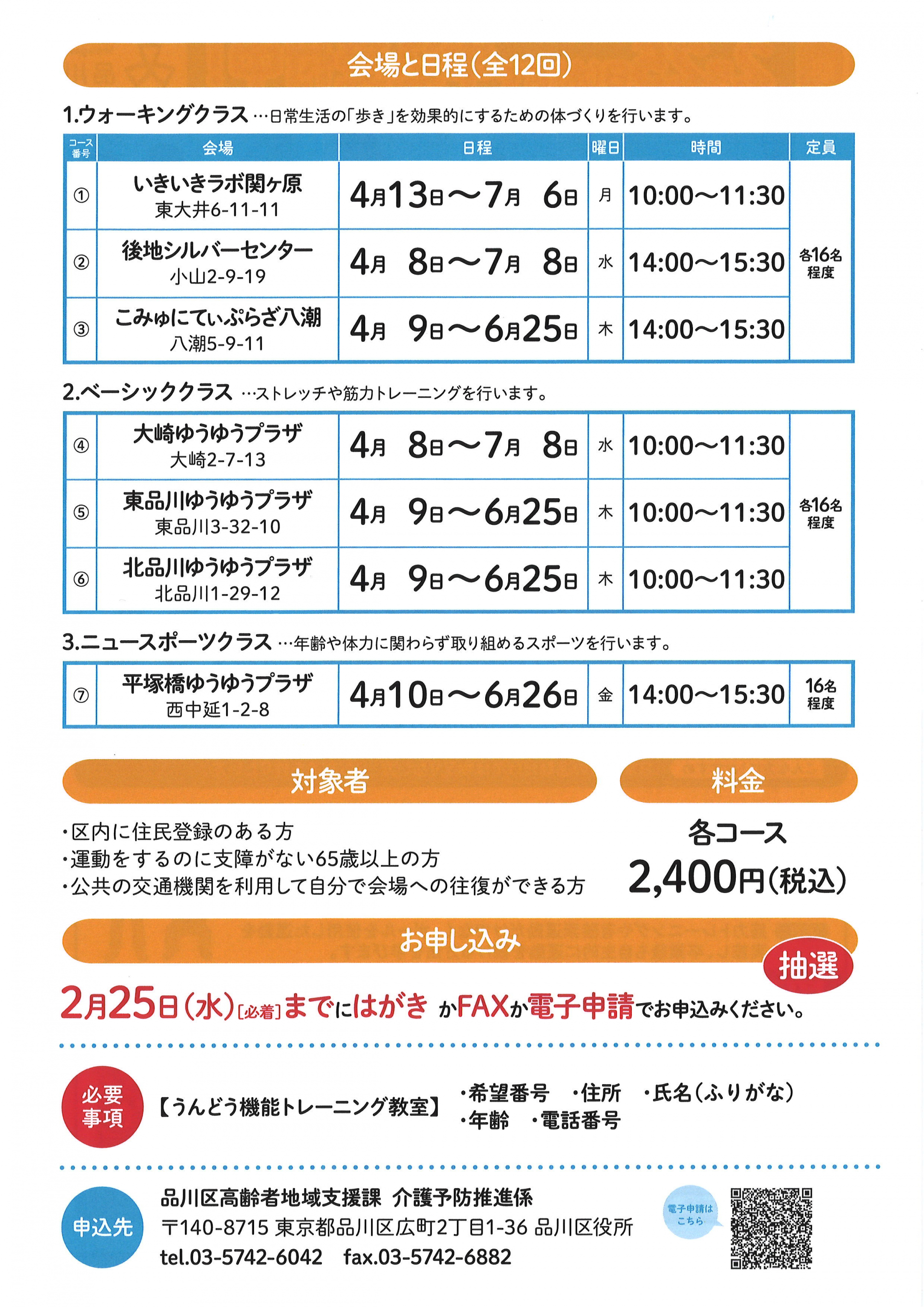 対象は①品川区内に住所登録のある方②運動をするのに支障がない65歳以上の方③公共の交通機関を利用して自分で会場への往復ができる方になります。