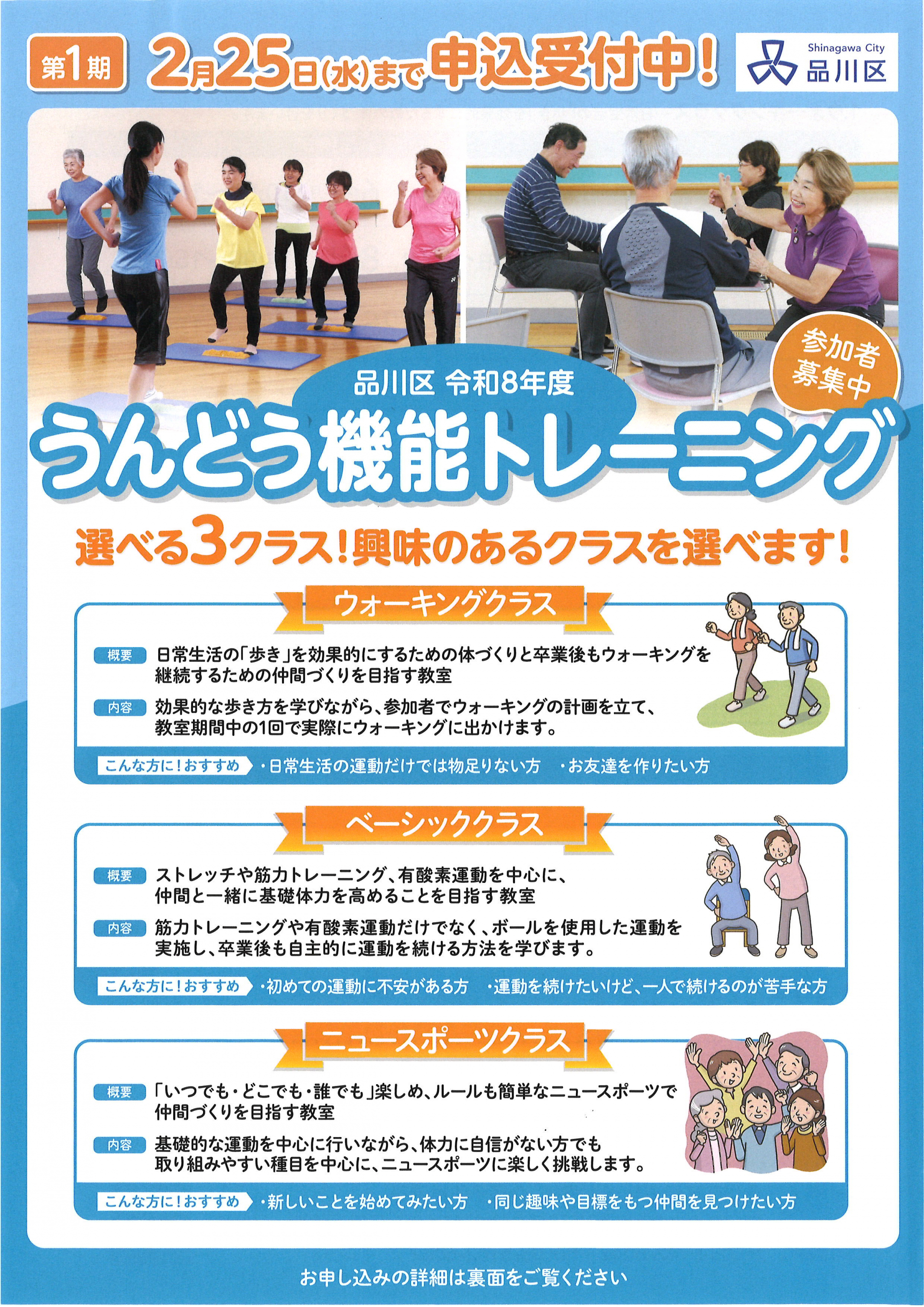 対象は①品川区内に住所登録のある方②運動をするのに支障がない65歳以上の方③公共の交通機関を利用して自分で会場への往復ができる方になります。
