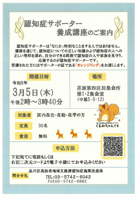 品川区から『認知症サポーター養成講座』のご案内です。
