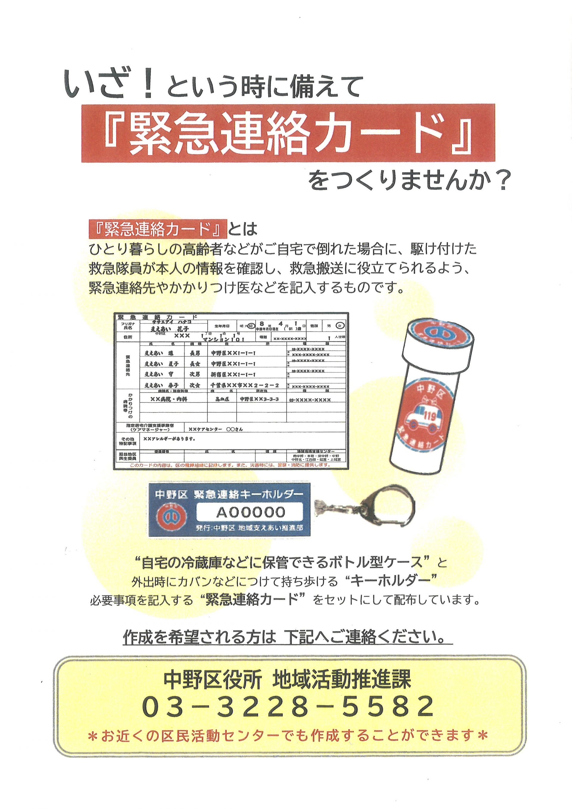 2024.12.27 居宅介護支援事業所 【弥生の園居宅】いざ!という時に備えて「緊急連絡カード」をつくりませんか? Tweet シェアする *自宅の冷蔵庫などに保管できるボトル型ケース *外出時にカバンなどにつけて持ち歩けるキーホルダー お近くの区民活動センターで作成できます♪ (S・Y) 前の記事 2024.12.27 居宅介護支援事業所 火の用心 次の記事 2024.12.27 居宅介護支援事業所 久しぶりに実家に帰ったら 一覧へ戻る