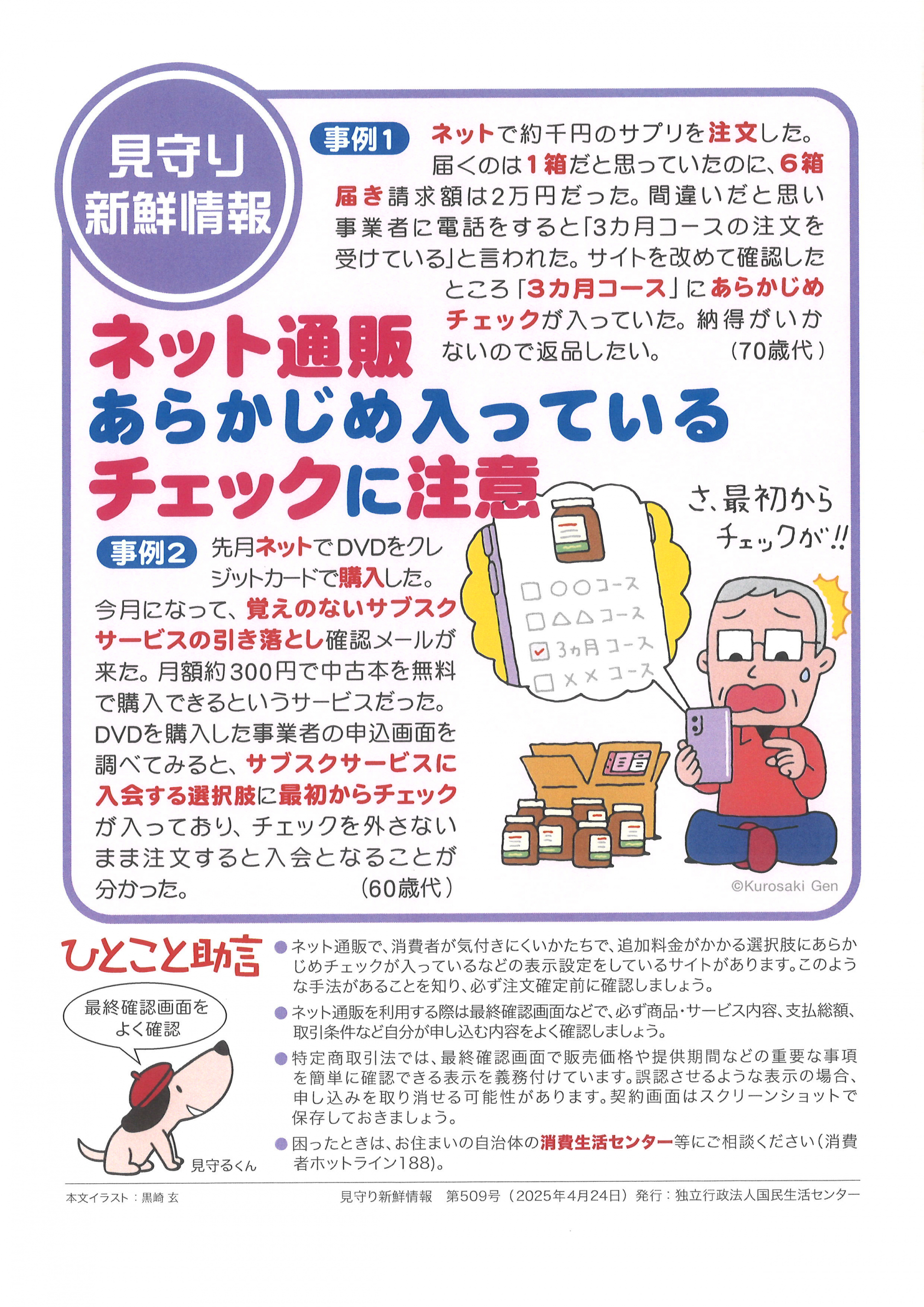 - ネット通販で、消費者が気付きにくいかたちで、追加料金がかかる選択肢にあらかじめチェックが入っているなどの表示設定をしているサイトがあります。このような手法があることを知り、必ず注文確定前に確認しましょう。