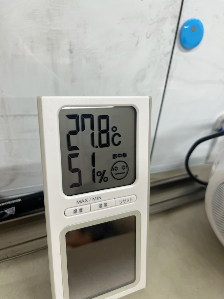 エアコンを強でフル回転し、扇風機・サーキュレーターを駆使しても27~29℃の室温。