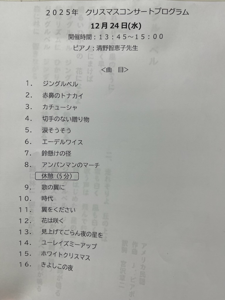 配布されたプログラムには全曲の歌詞が載っているので、招待されたご家族やケアマネも一緒に声を合わせて歌えます☆嬉しいっ。