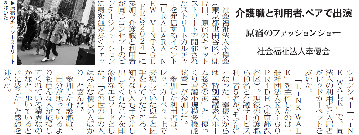 3月17日に原宿で行われた一般社団法人KAiGO PRiDE主催のファッションショー【LINK WALK】に奉優会の職員とご利用者様が出演したときの記事が高齢者在宅新聞に掲載されました。(3月27日発行)
