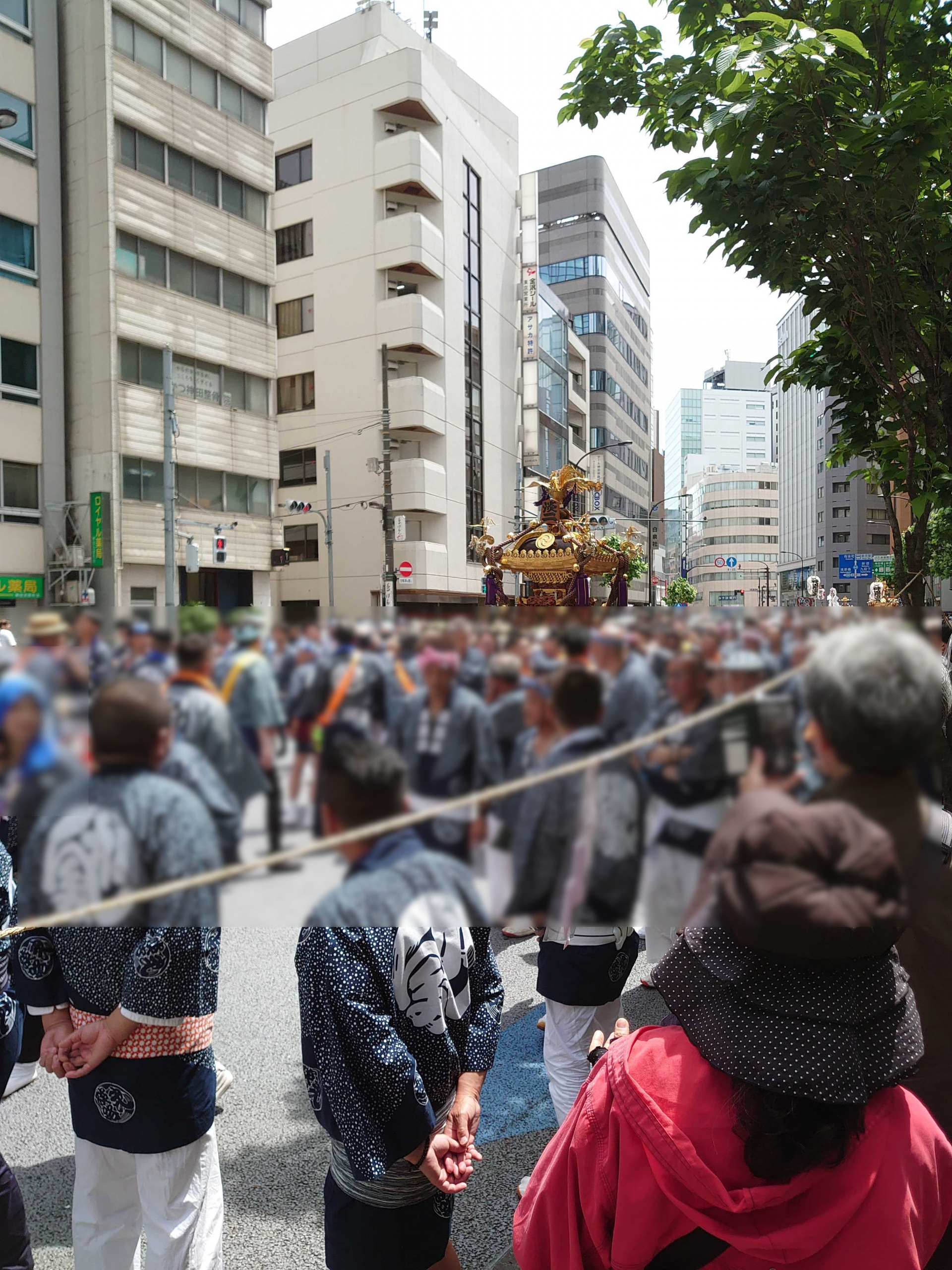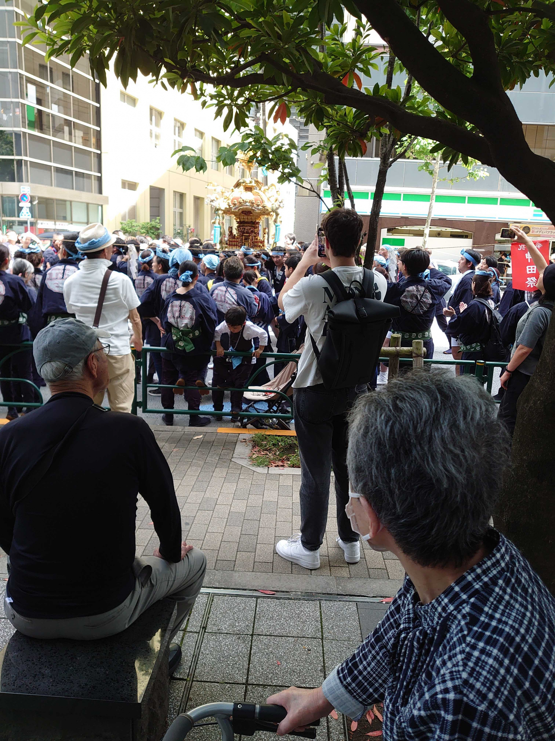 目の前の通りを神輿が神田神社へ向け、次々と通っていきます。
