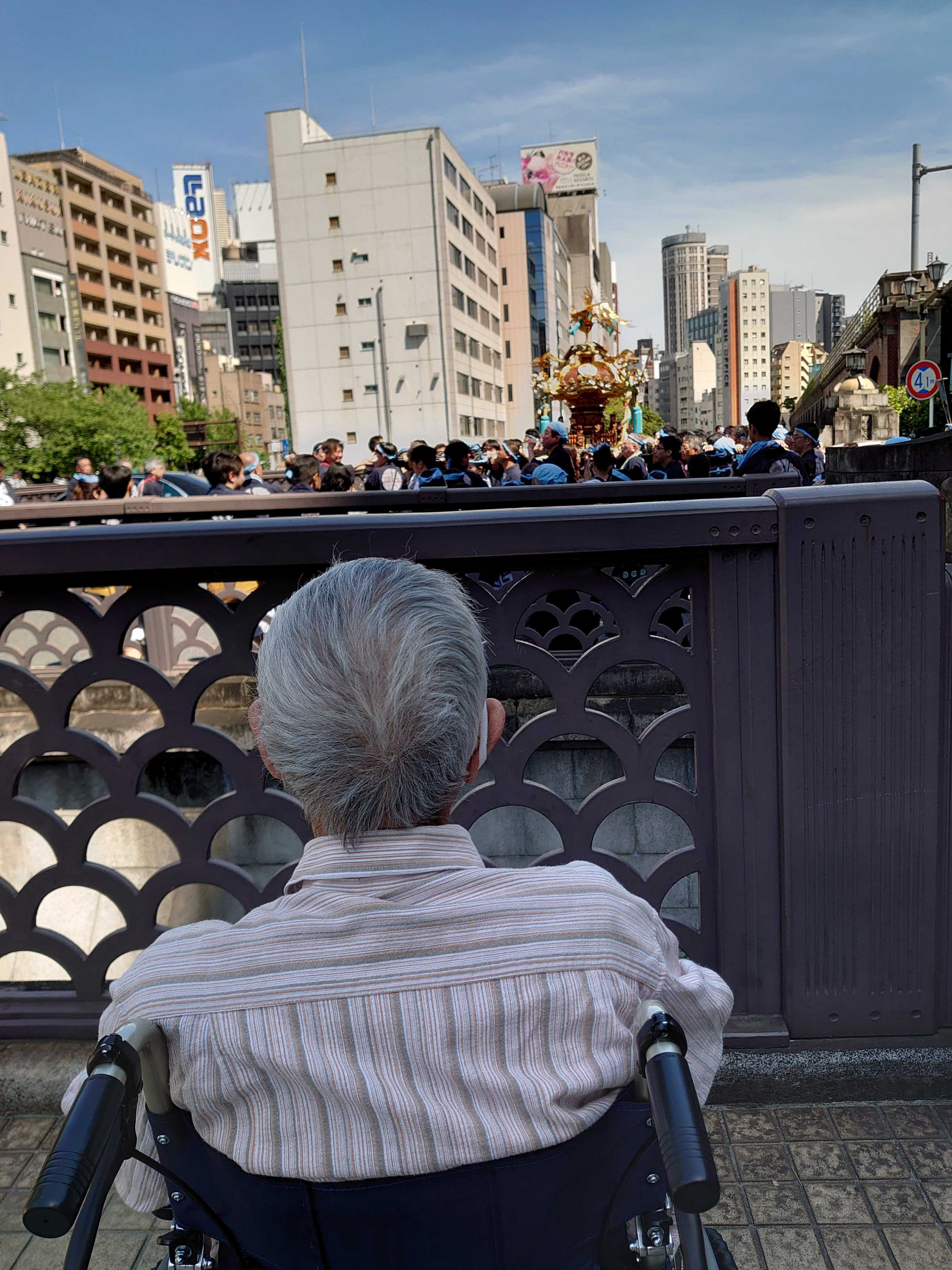 ショートステイ淡路の中まで聞こえる掛け声に気付き、外までご利用者様も神輿を見に出掛けました。