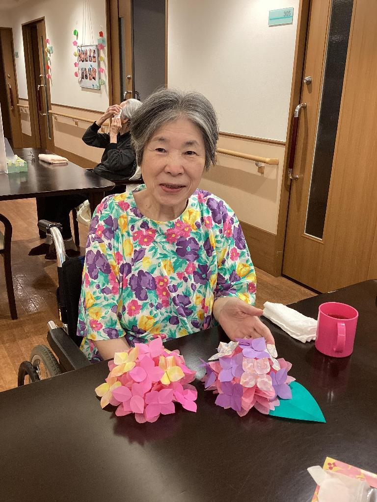 今回はお花紙と折り紙を使いアジサイの壁画を作成しました。