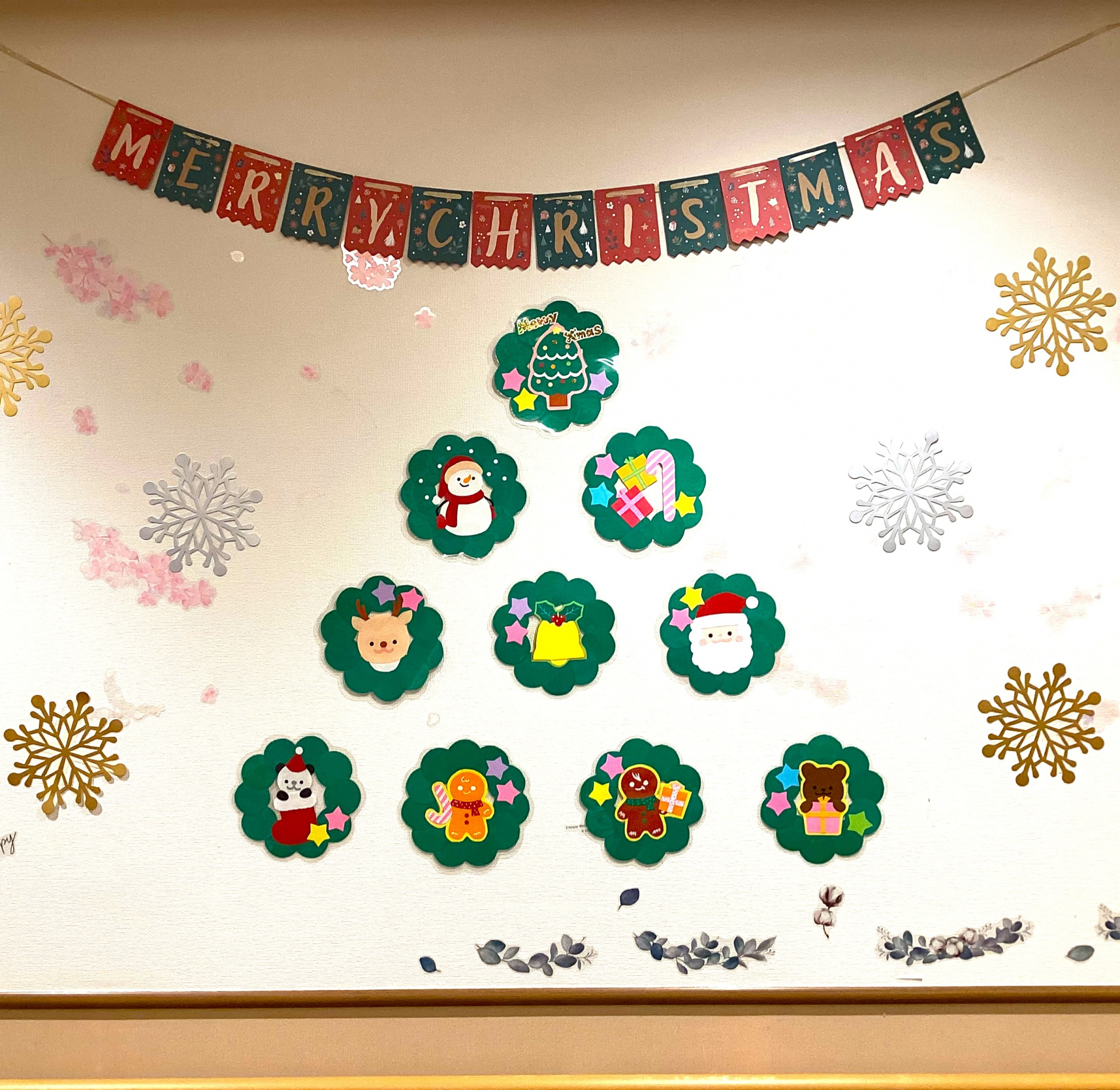 大急ぎでフロアの飾りつけをしましたが、今年はリースを何個か作り