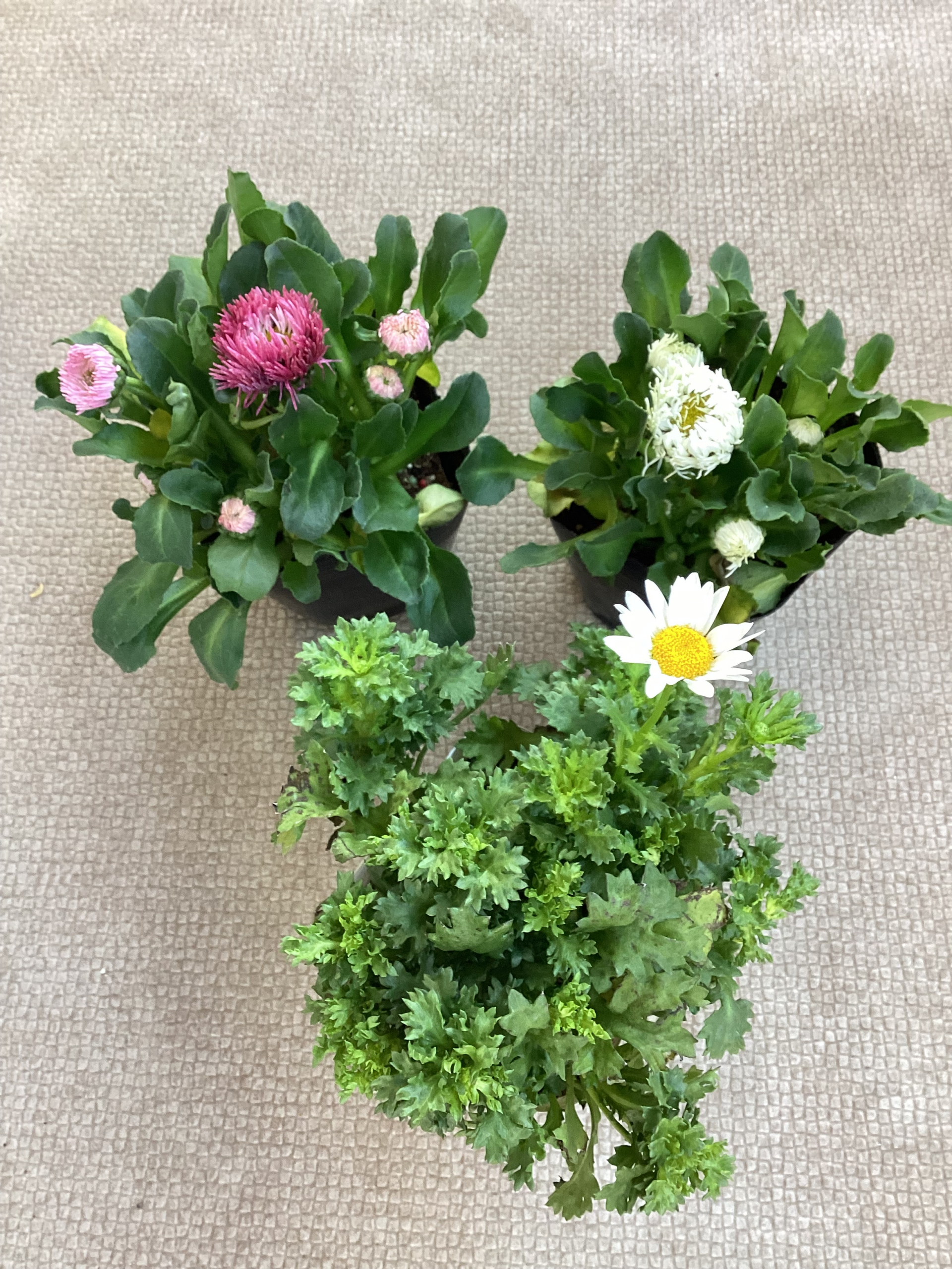気温9℃だよ。寒空の下、葉を寄せ合って2種類の花が咲いていました。