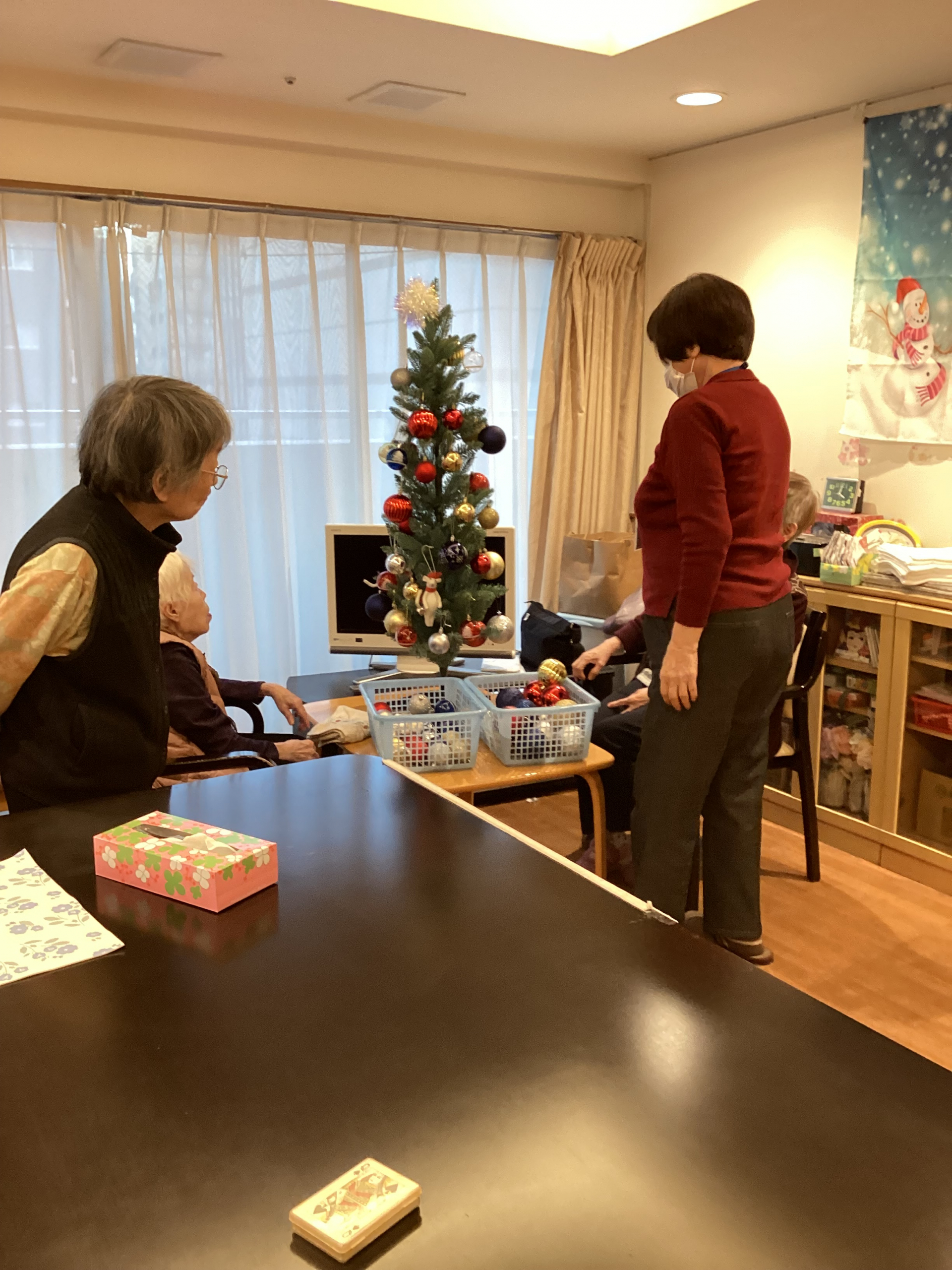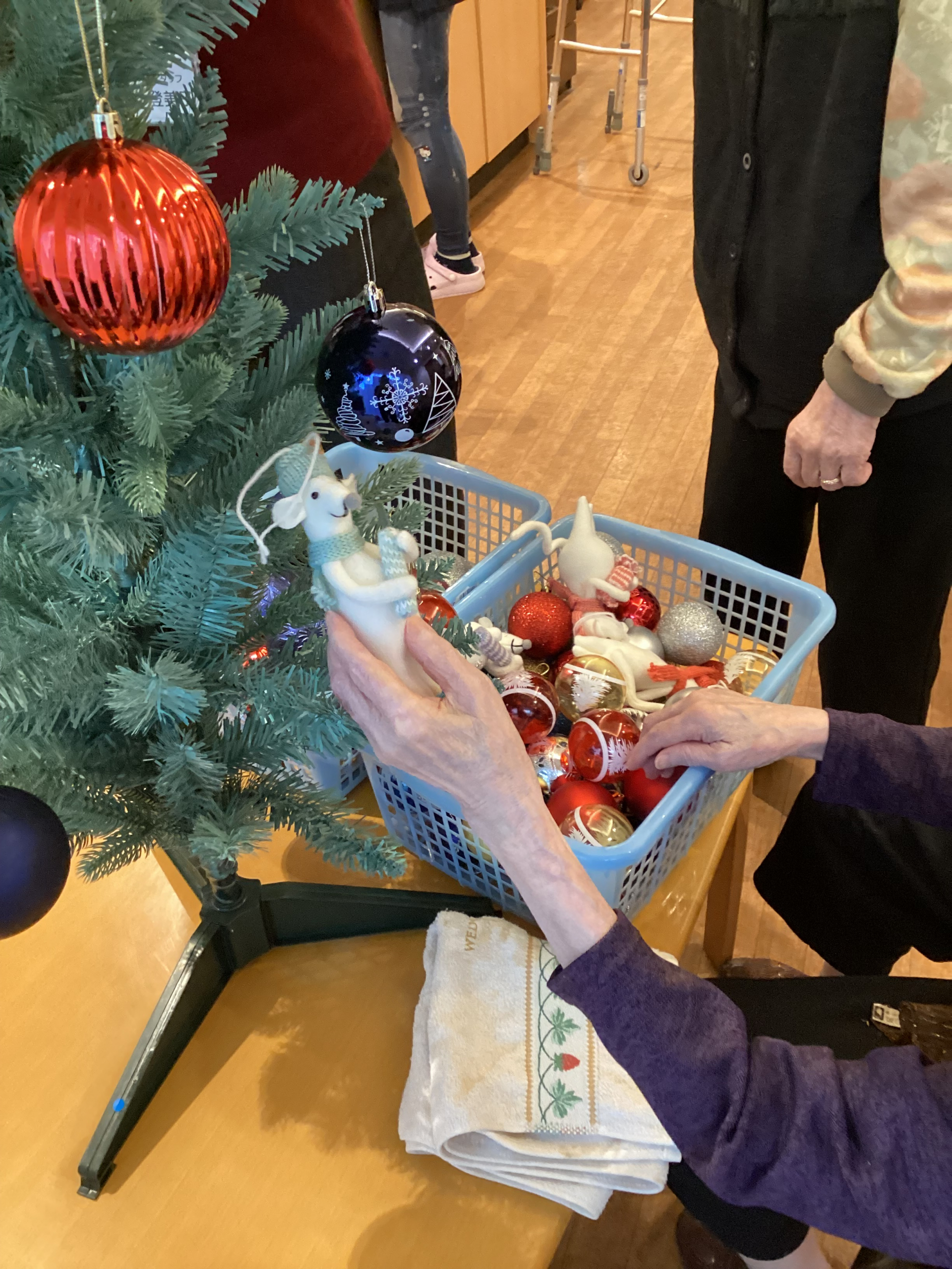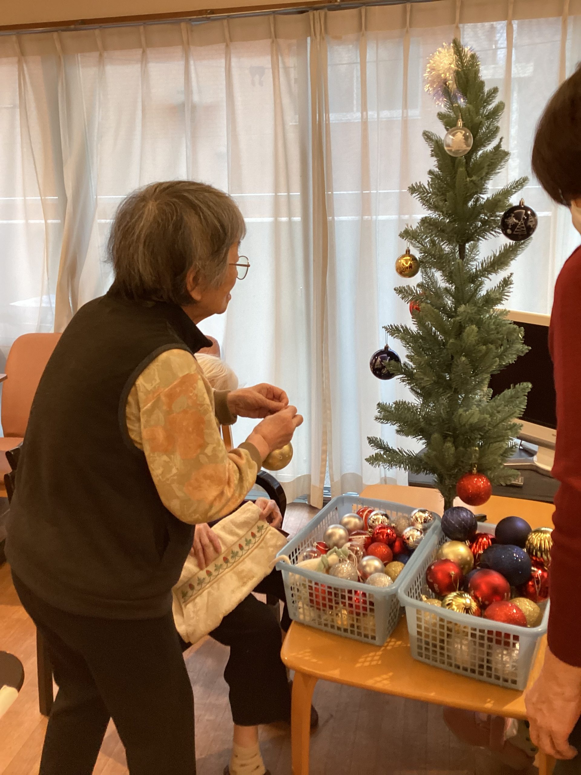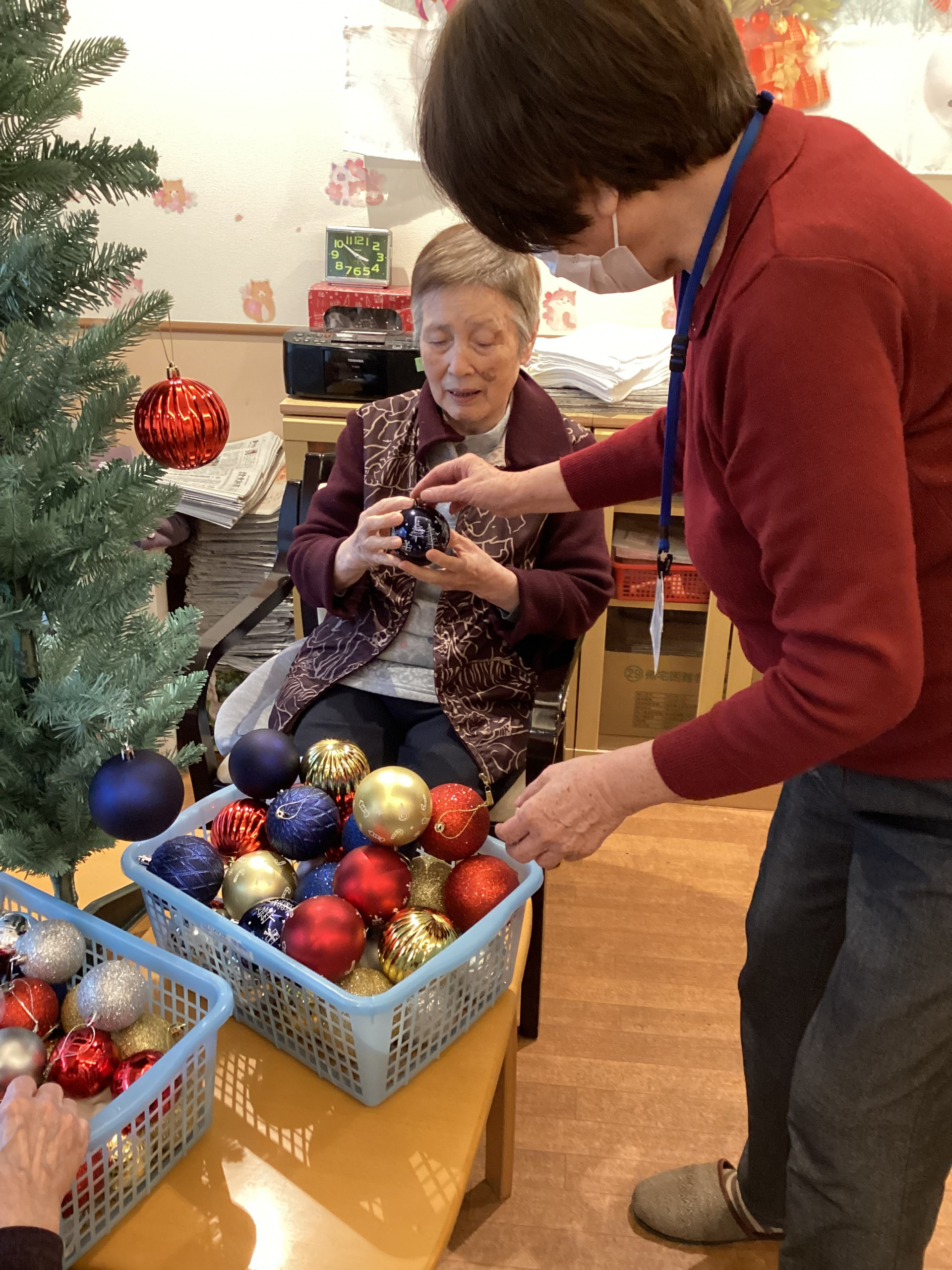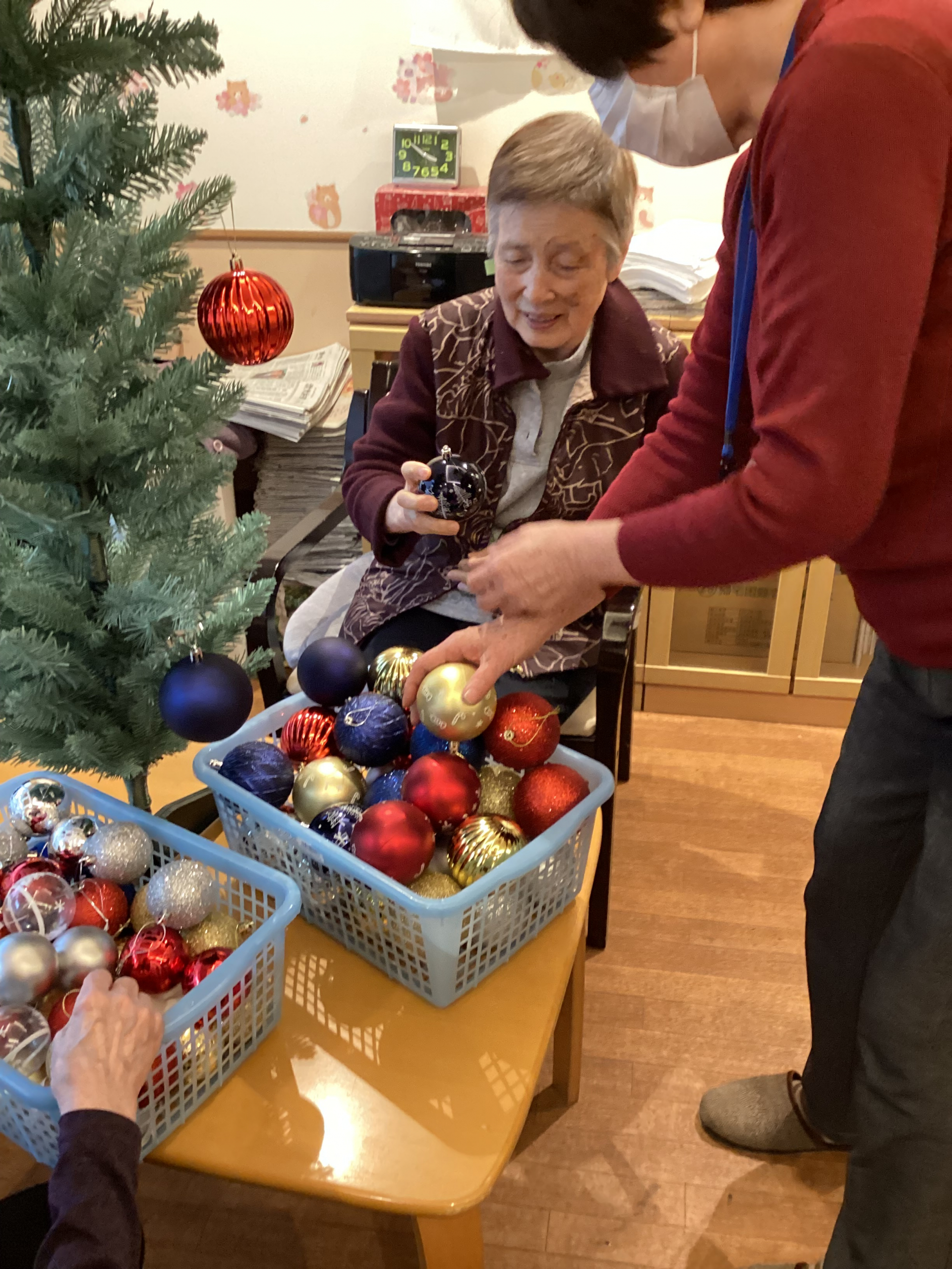 「こんなこと、やったことないから、初めて」じゃあ、この辺でいいんじゃない?と手を添えられながら飾りつけを行っています。