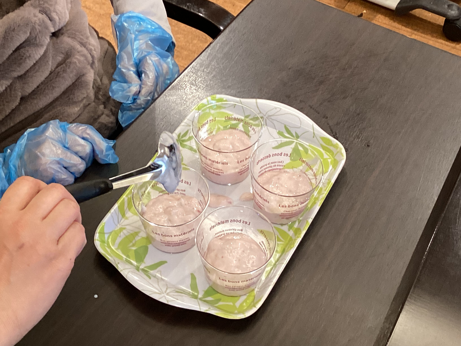 まずはフルーチェから、ご入居者さんに混ぜてもらったものを器に4等分にしました