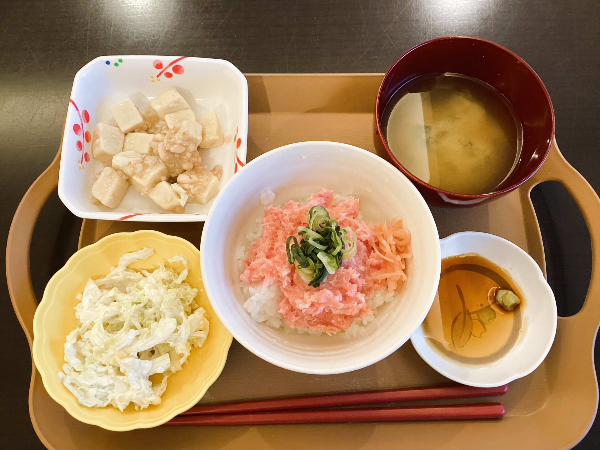 今日はネギトロ丼と高野豆腐のそぼろ和え、コールスロー、お味噌汁です!