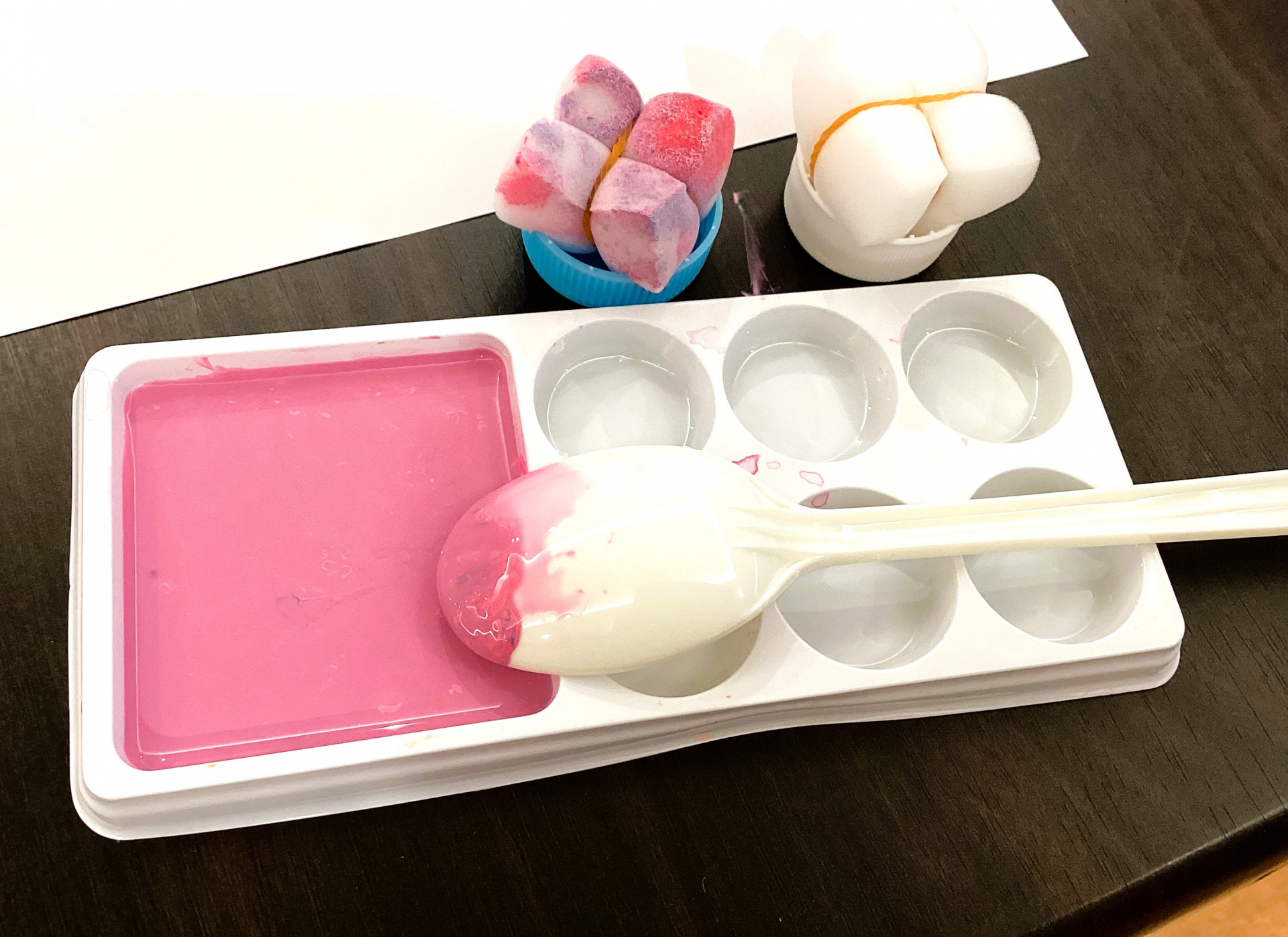 まず激落ちくんを輪ゴムで十字に縛り花びらのスタンプを作りました
