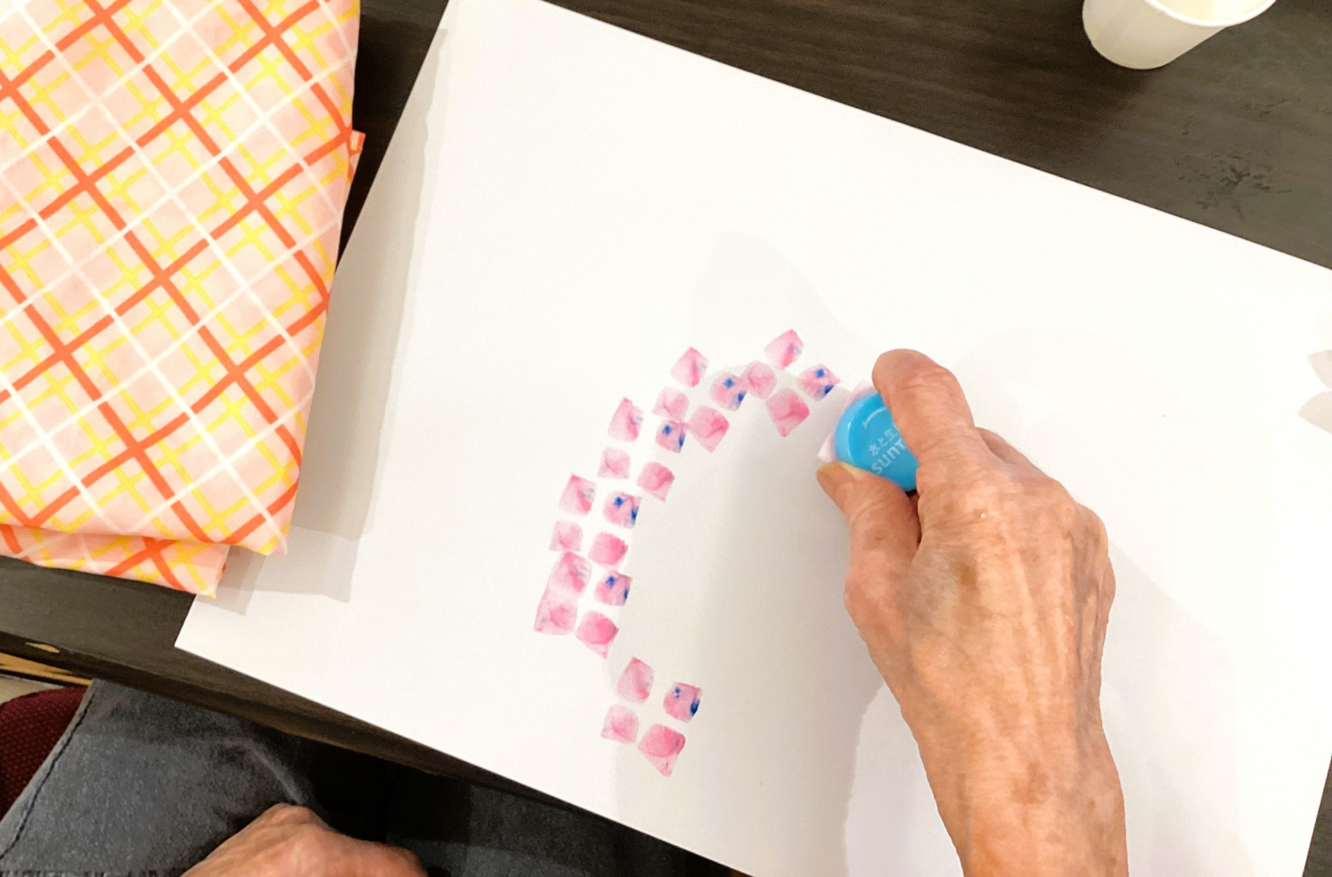 ご入居者のIさんと一緒に画用紙にスタンプしていきます!