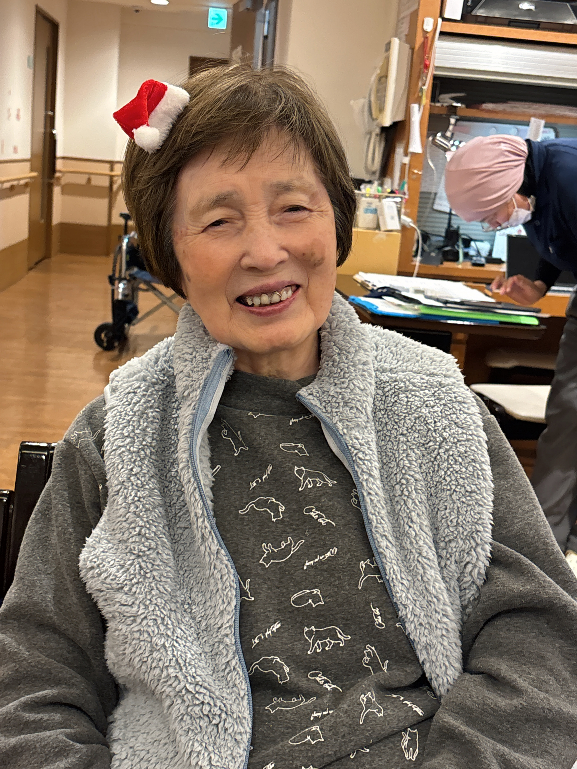 サンタの帽子の髪飾り、似合ってます。 待ち遠しいですね。心踊る気分。タッタタラリラ。