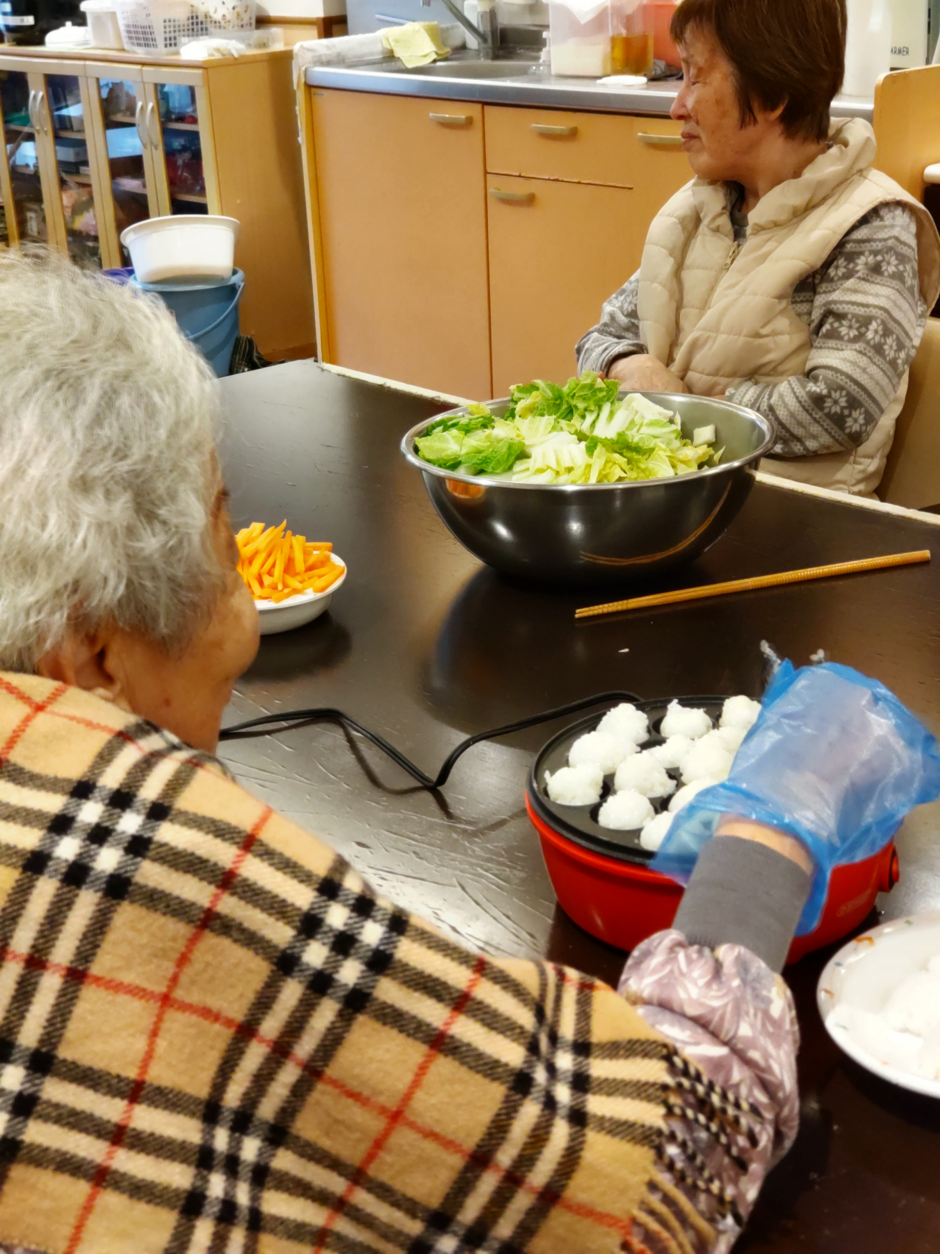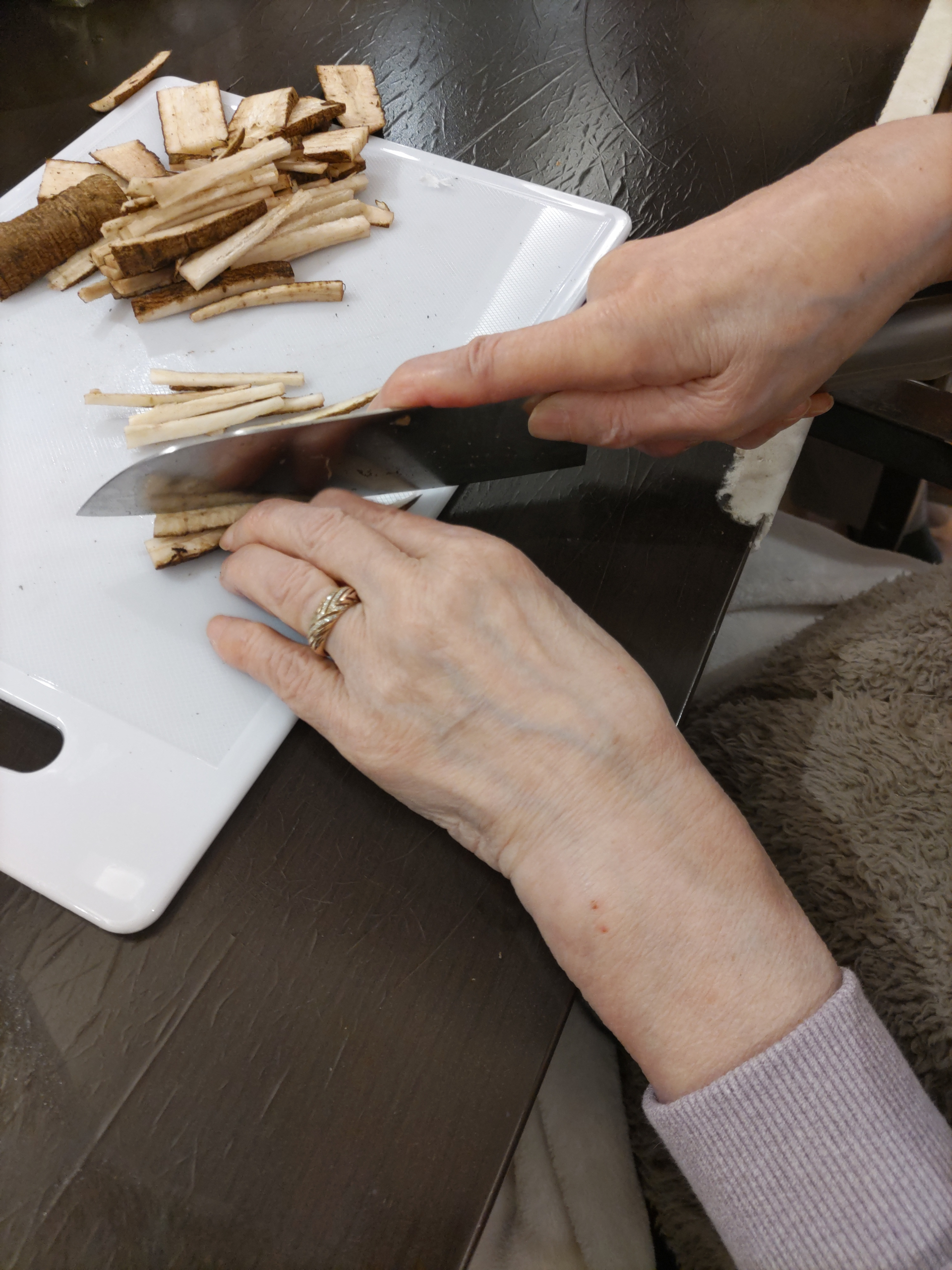 今日は、フロアの利用者様と、きりたんぽ鍋を作りました。たっぷりのごぼうと、キノコたち。鶏肉からは、よいお出しが出てきます。人参・白菜・水菜と続きます。とても立派なごぼうは、硬くて切れるかしら?栄養士の心配をよそに、みなさん、しっかり包丁を握り、カットされていました。