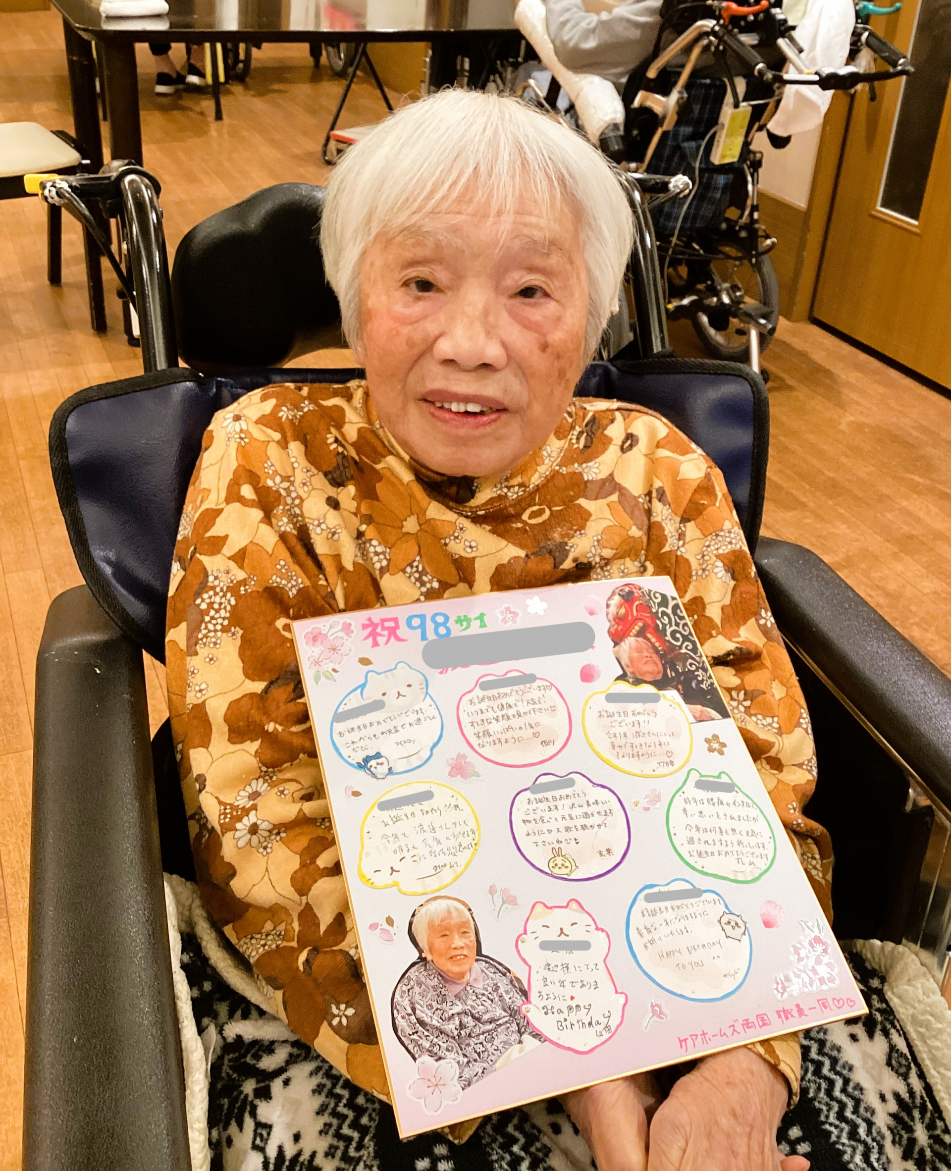 2026.01.22 活動報告(IN) お誕生日会♪ Tweet シェアする こんにちは!今日は4階のご入居者のお誕生日会をひらきました♪ なんとMさんは99歳、TさんとHさんは98歳です!!素晴らしい!! 皆さんでケーキを食べながらお祝いをしました♪ 介護課 玄葉 次の記事 2026.01.15 活動報告(IN) 獅子舞がやってきた! 一覧へ戻る