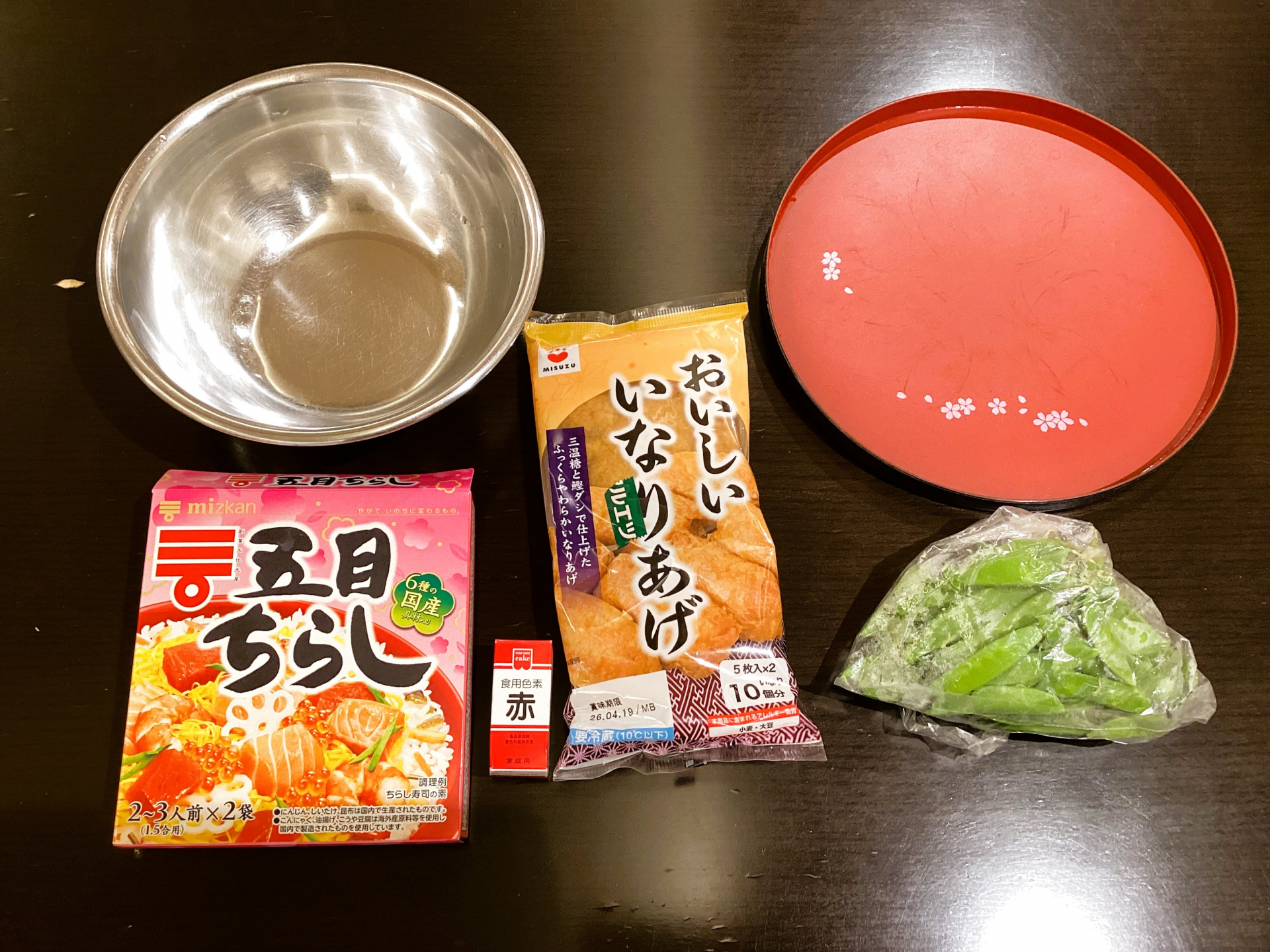材料はこちら!五目ちらしに食用色素、お稲荷の皮、きぬさや