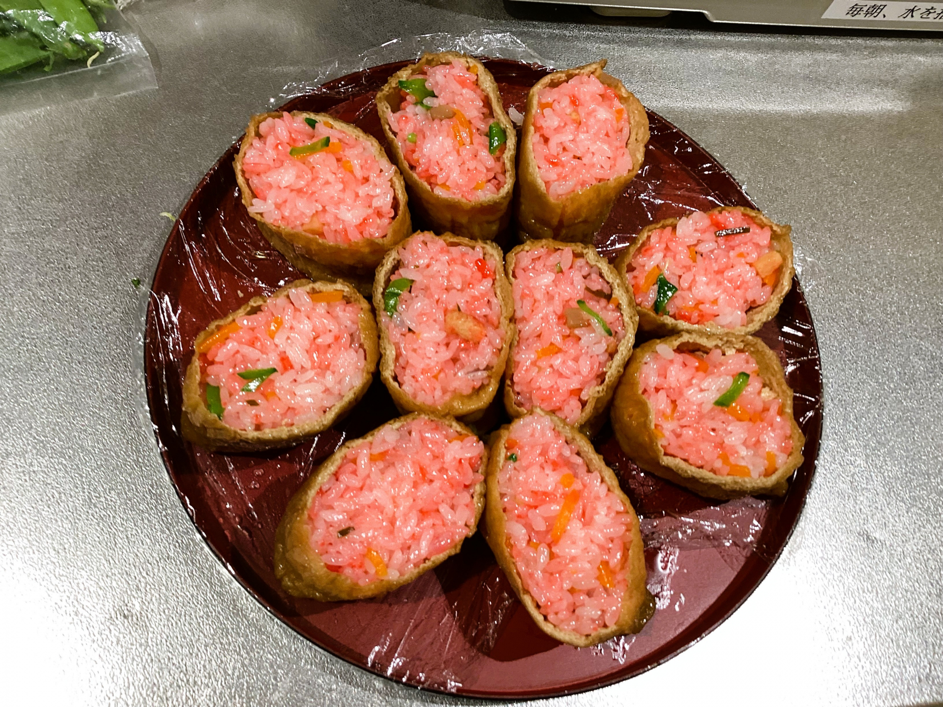 綺麗に染まりました、きぬさやを混ぜていなり寿司の皮に