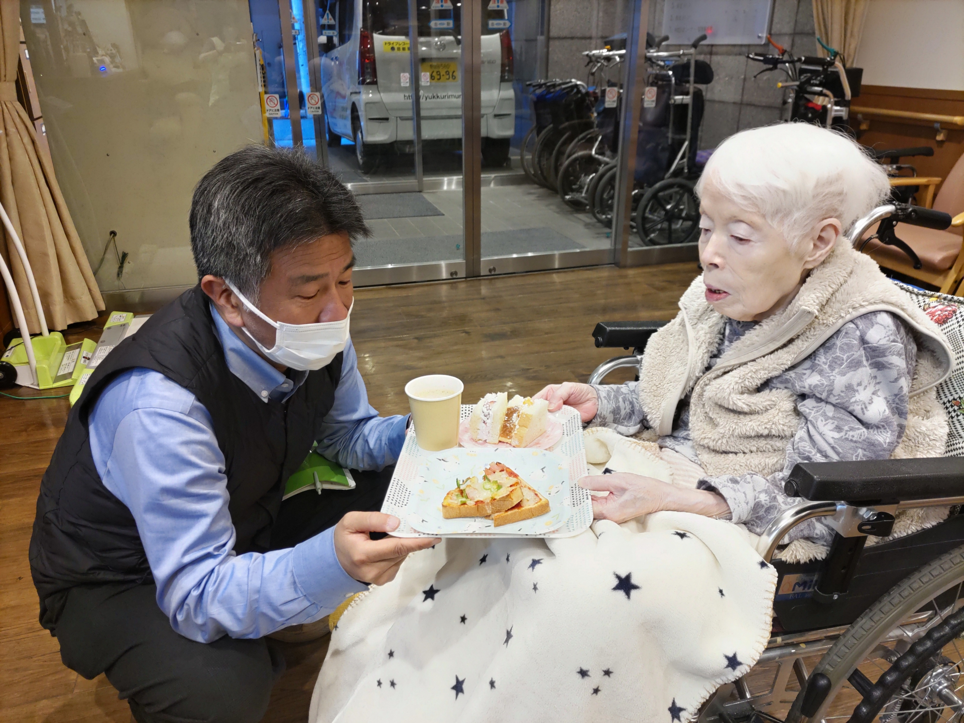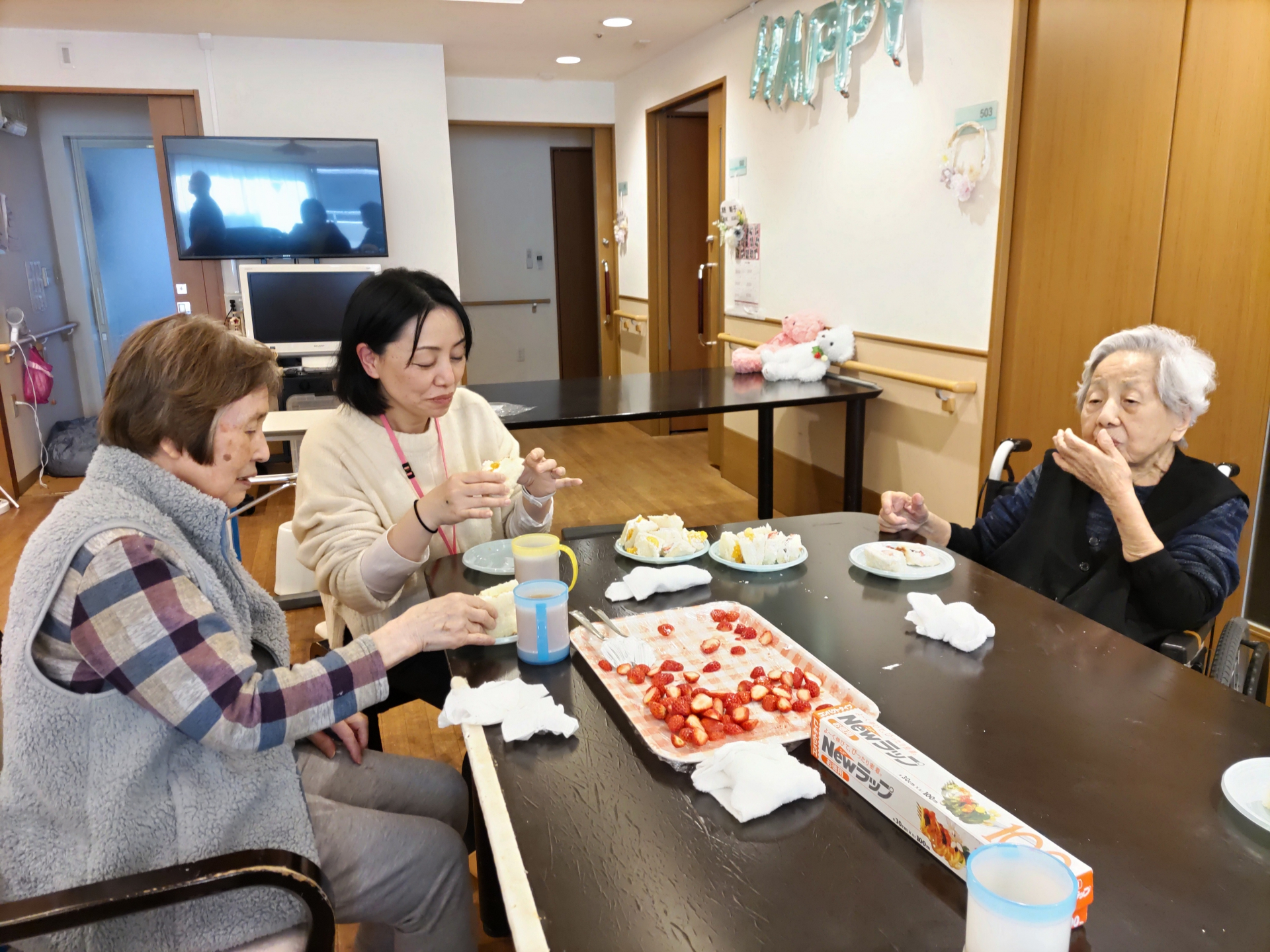今日は、フロアの利用者様と一緒におやつにフルーツサンドを作りました。ホイップクリームを塗り、いちごやミカン缶を挟みました。練乳をちょっとだけ加えるのがポイントです。苺が甘くておいしーい。とっても美味しく出来ました。 最後は、いつもの通りの、お・も・て・な・しで終了しました。支援課 管理栄養士 小川
