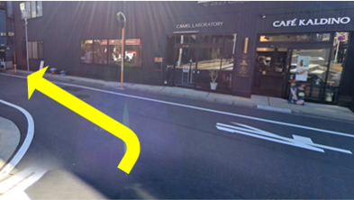 ❷つきあたりを左折します。