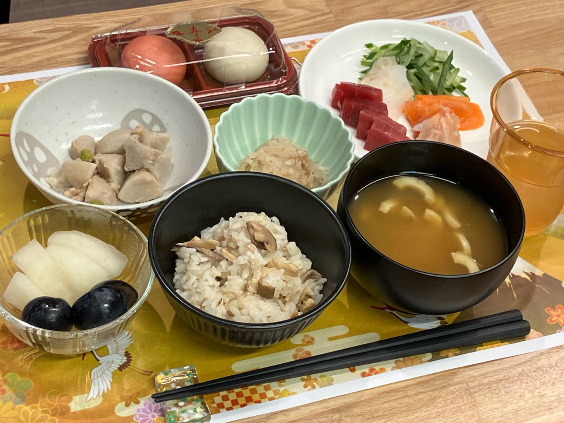 食事は、秋のきのこご飯・お刺身・紅白饅頭などのお祝い膳をご用意して、皆様に喜んでいただけたようでした。
