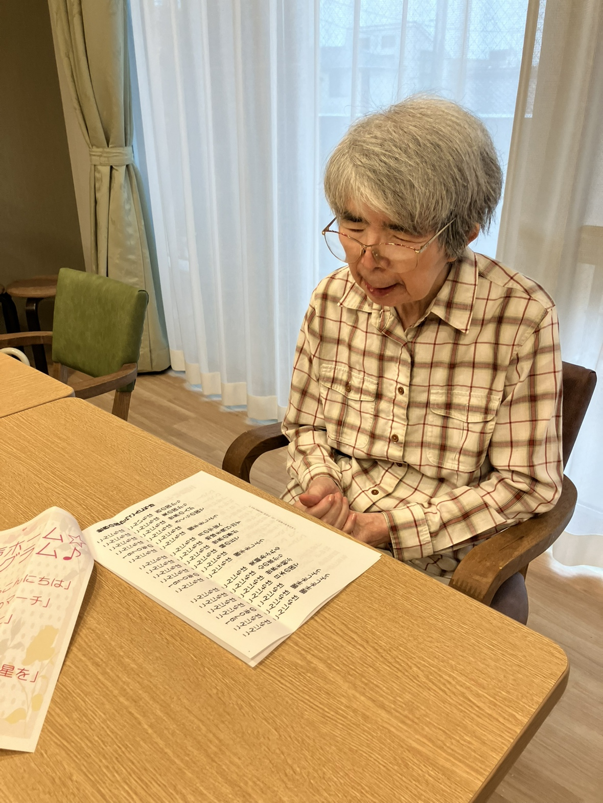 みなさん、体を動かし、大きな口をあけながら「懐かしい!」「これは知ってるわ」「歌うのなんて何年ぶりかしら」と楽しい30分を過ごしました。