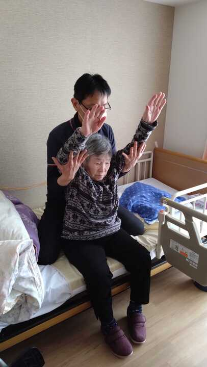 固まった関節可動域が柔らかくなるよう実施しています。