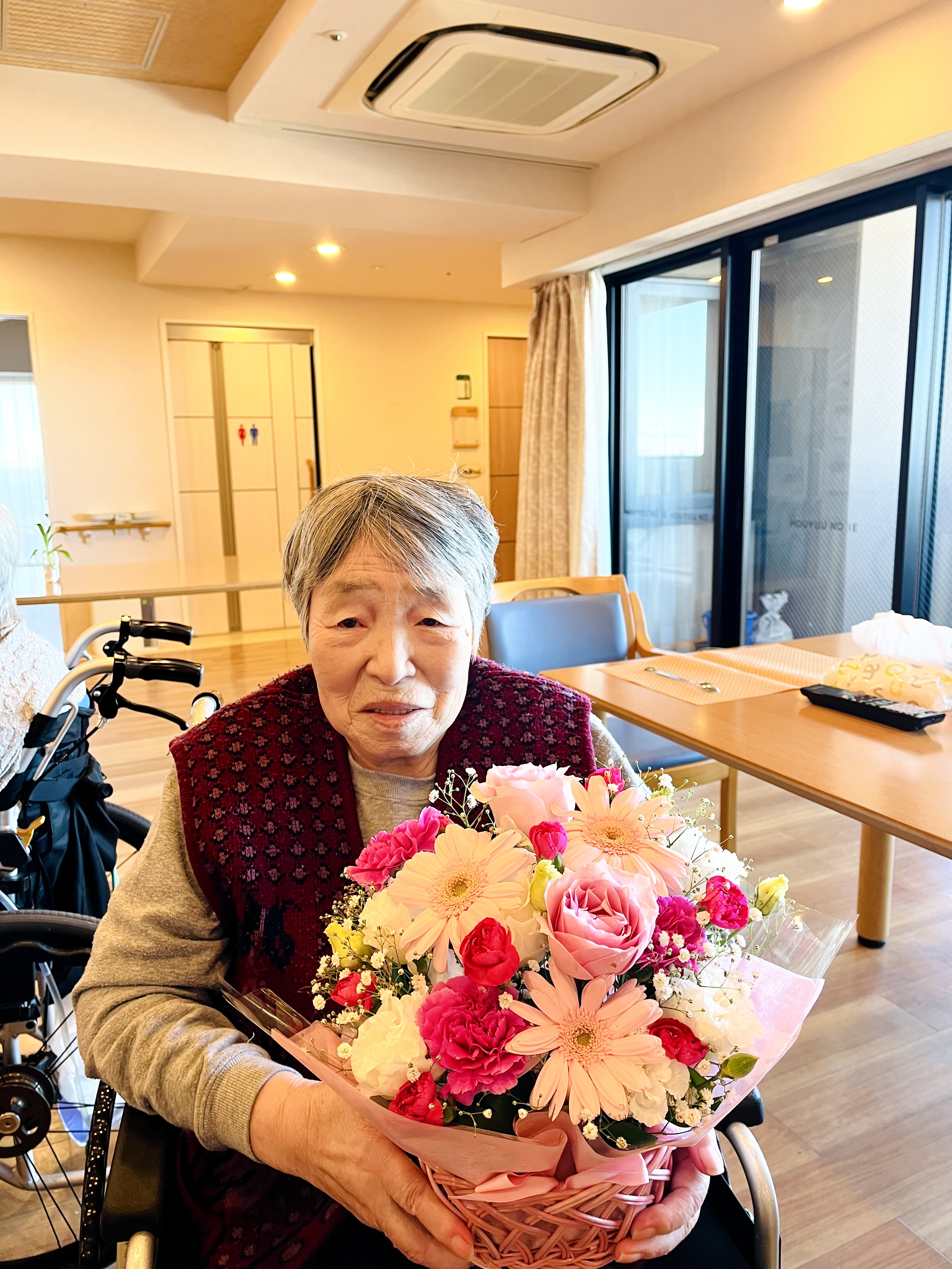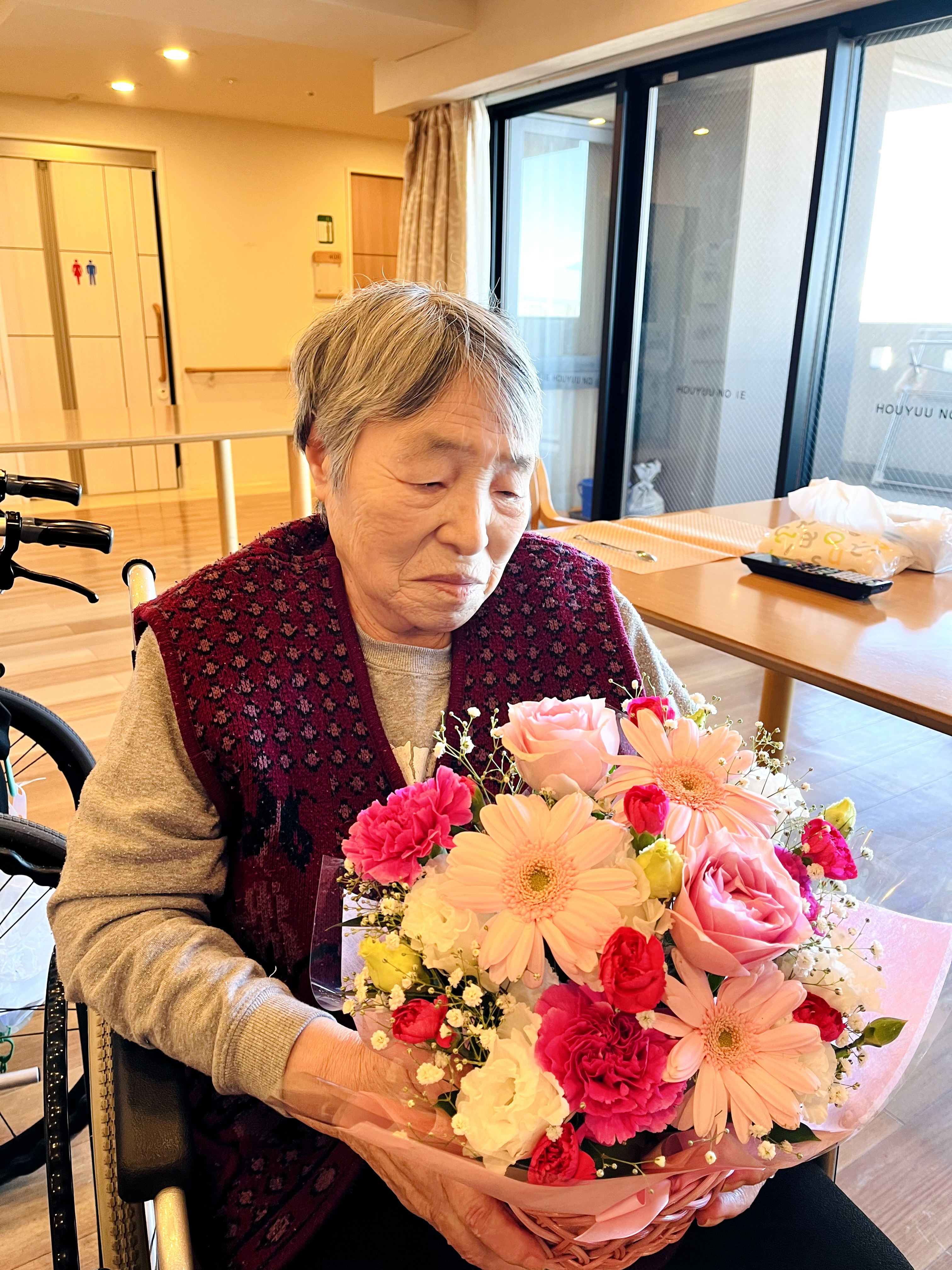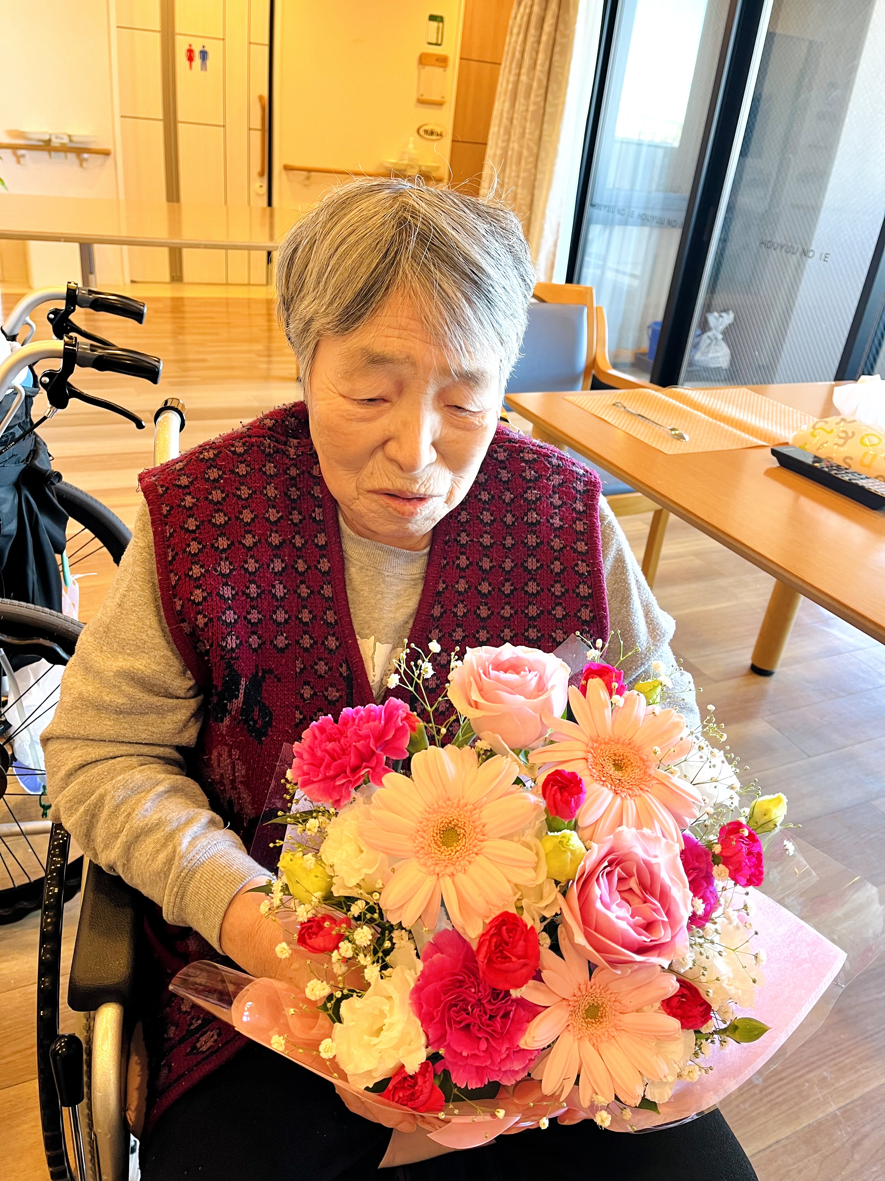 おやつ中、お花を席までもって来られ、すごく喜んでいました(*ノωノ) その時もご自分で水を上げました(^^)/