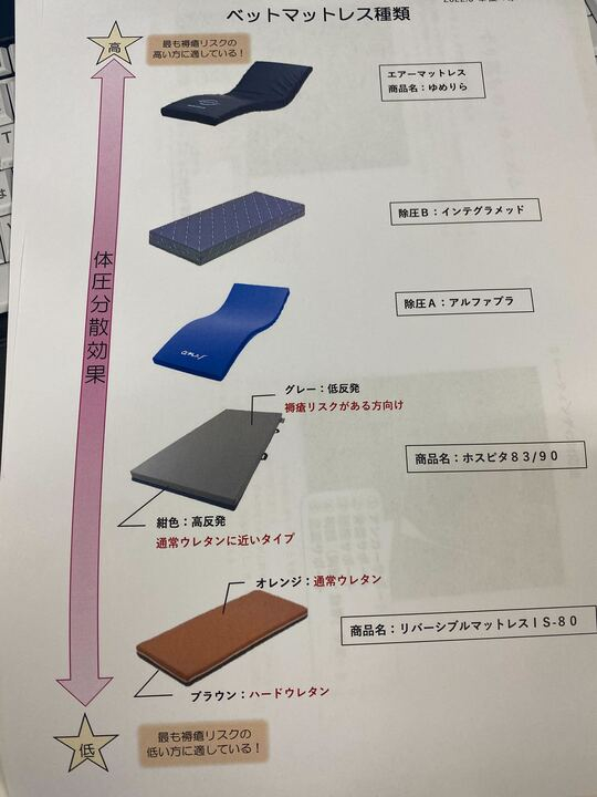 2024.05.14 特別養護老人ホーム ベッドマットレスの種類 Tweet シェアする お世話になっています。 本日は施設で使用しているベッドマットレスについてご紹介します。 現在使用しているベッドのマットレスは全部で6種類あり、用途に合わせて使用しております。 前の記事 2024.05.14 特別養護老人ホーム ♦余暇支援♦3北~カレーの日~ 次の記事 2024.05.14 特別養護老人ホーム むくみについて 一覧へ戻る