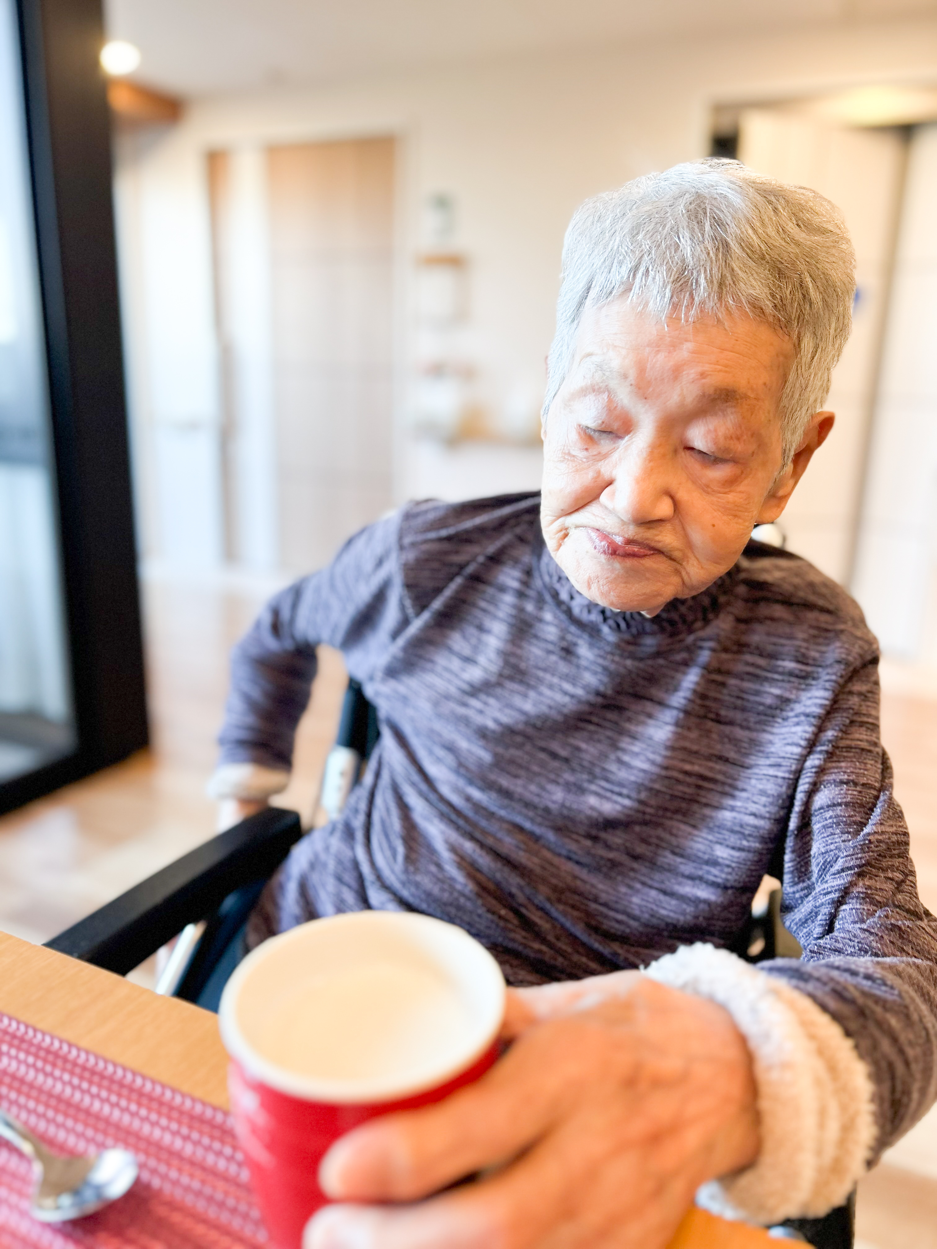 朝は牛乳を飲まれます。「美味しいね」と笑顔で飲んでいました。(*^^*)