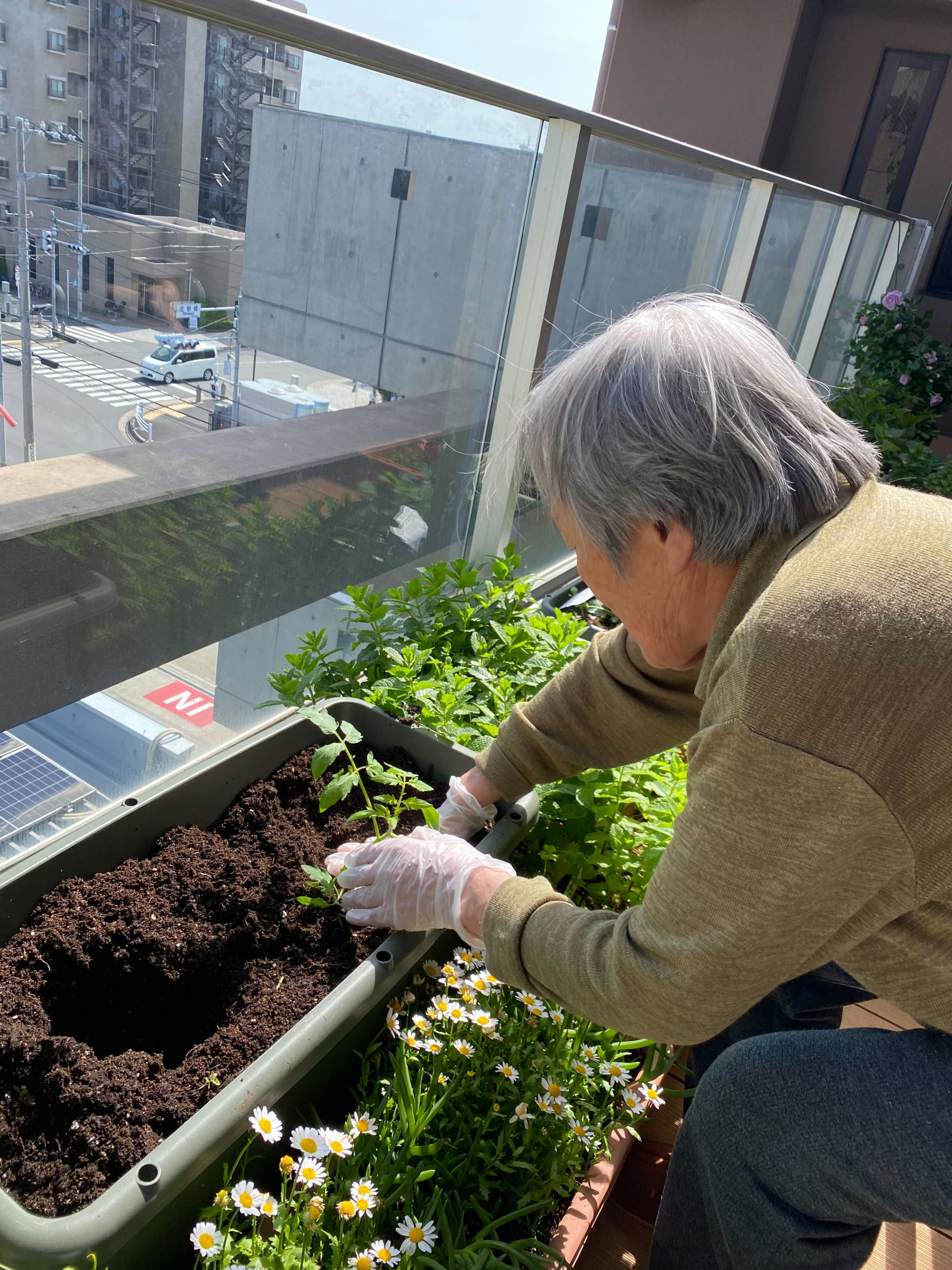 今日はお日様の下で、皆様と一緒にベランダ菜園を楽しみました。