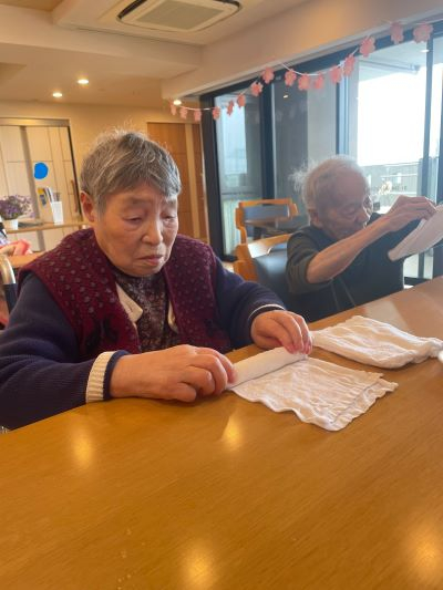 おしぼり畳みを始めると、隣の方にも声をかけて一緒に。