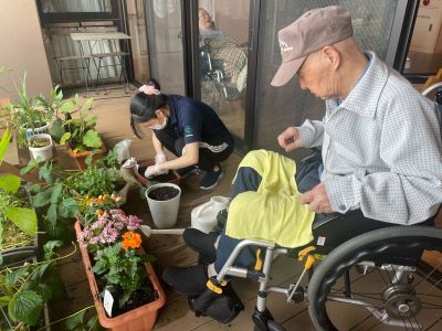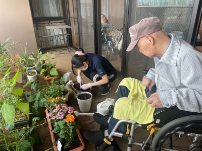 今日はいいお天気なので、職員と一緒にベランダで植え替え作業を行いました。