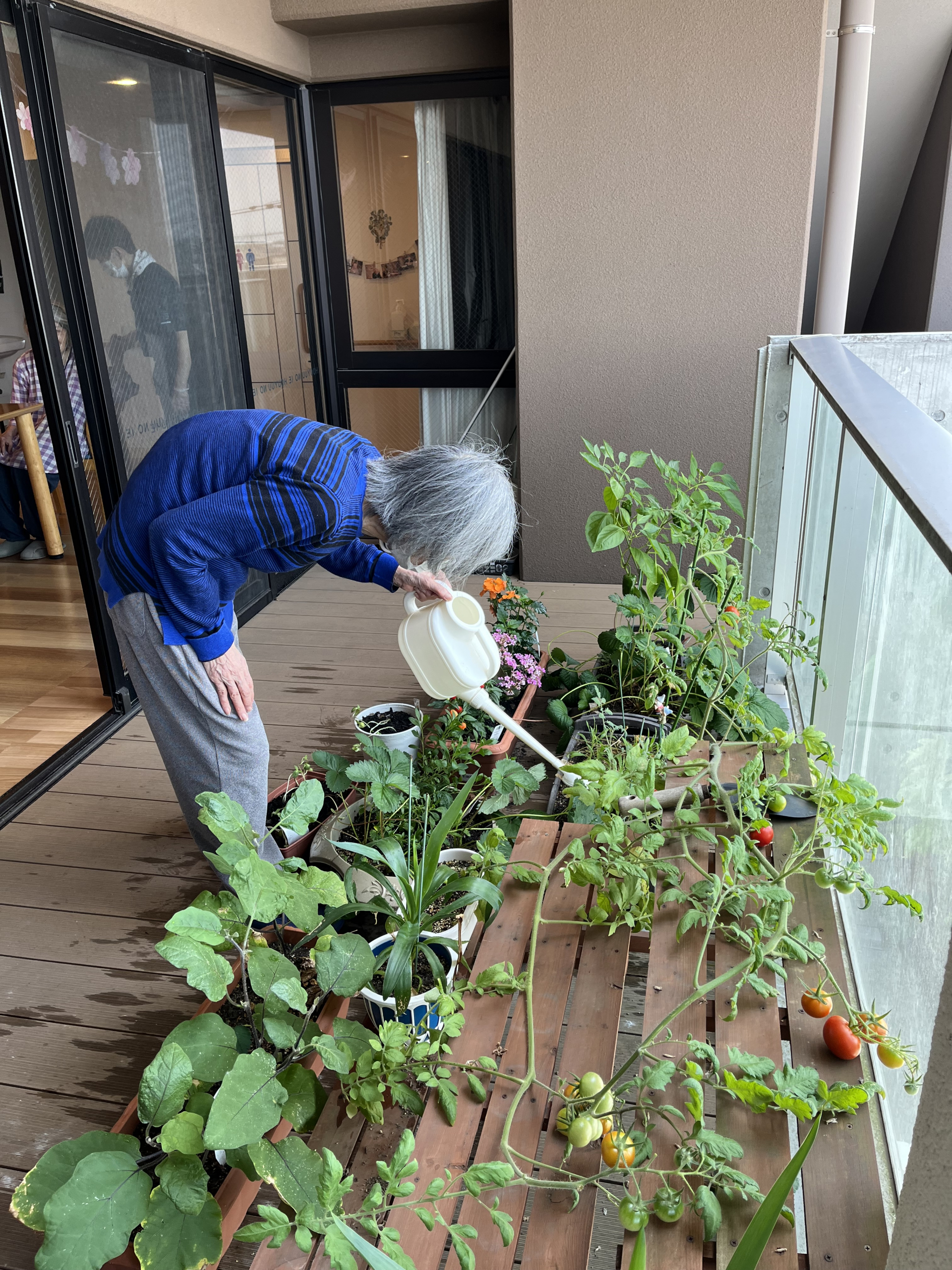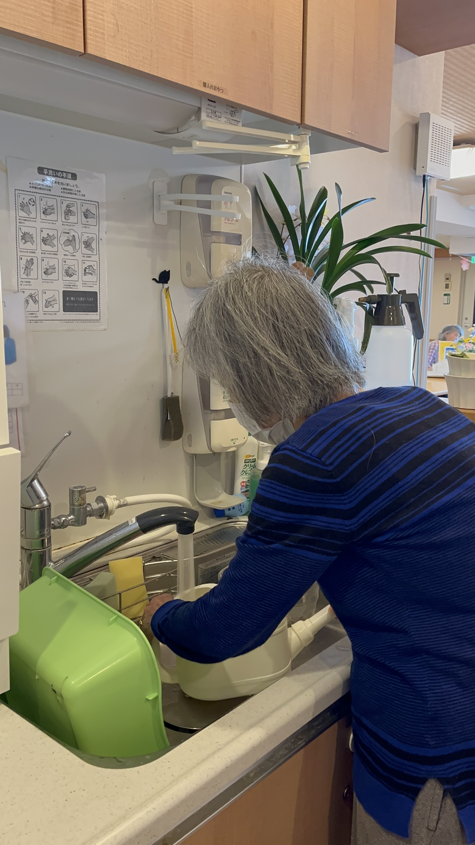 ベランダで日光浴後、本人が職員の方に来て「今日水があげたんでか。もしかしたら私がやりますよ。」と仰いました(^_-)-☆