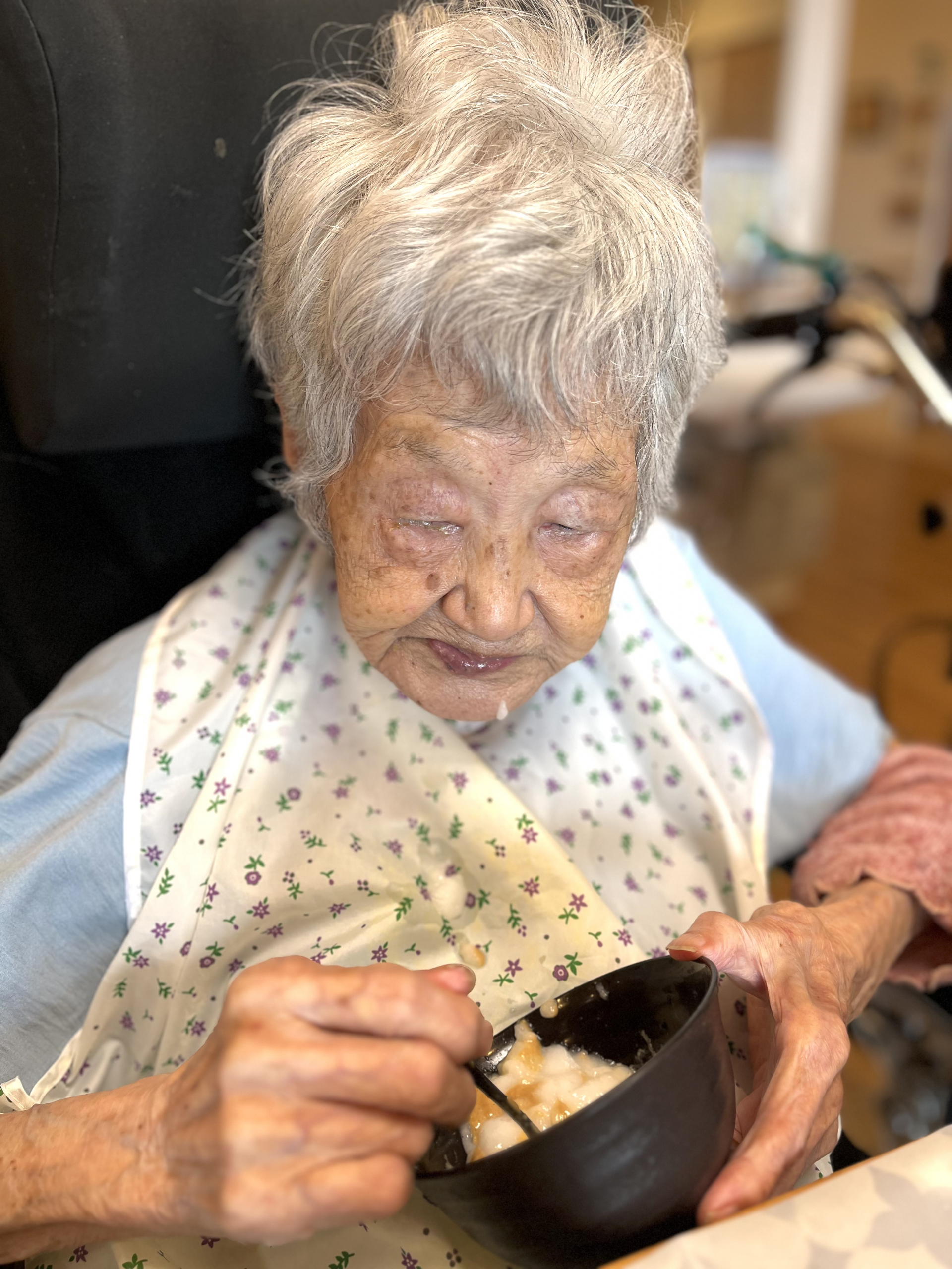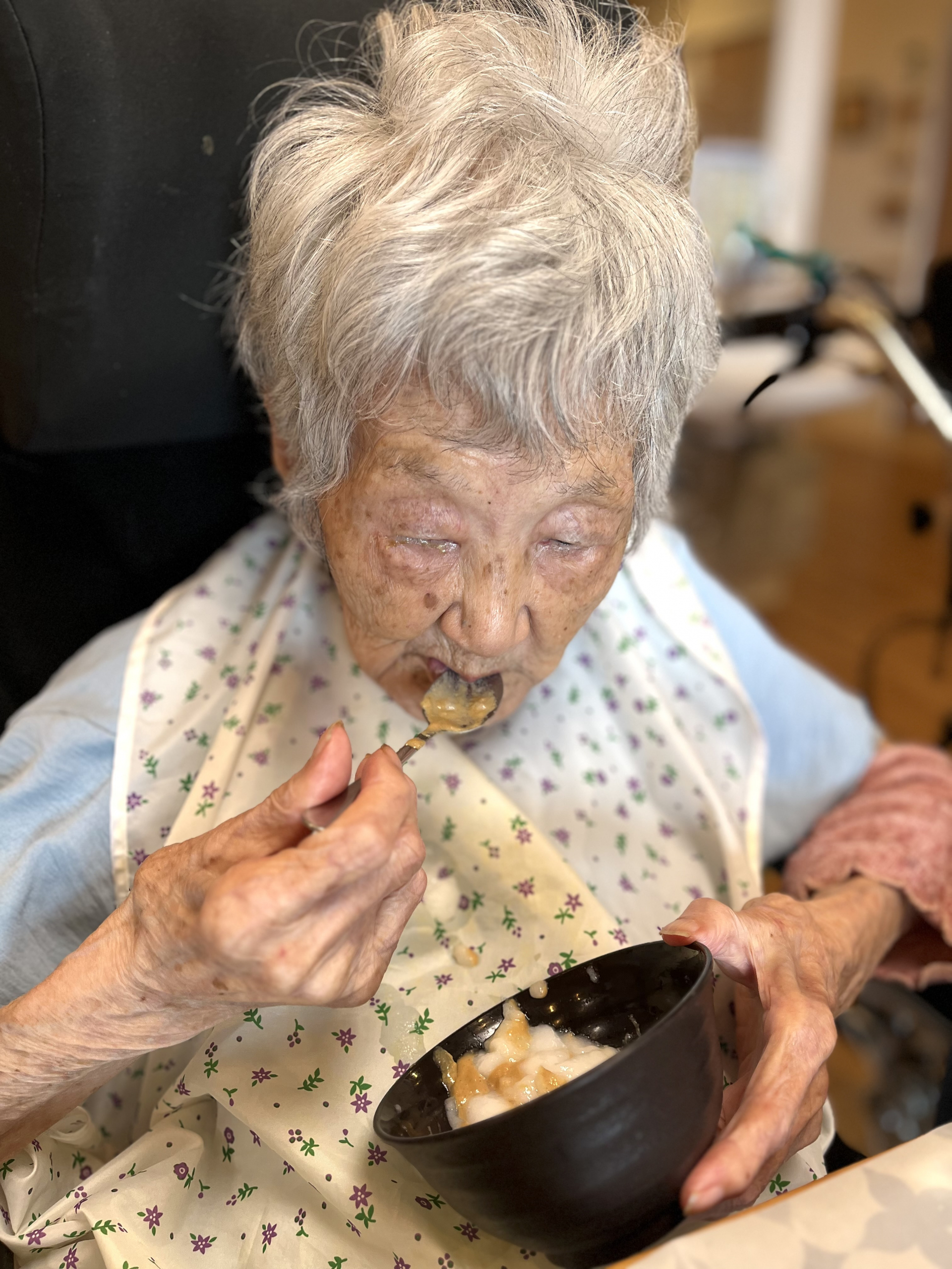 最近ご自身で食事を進まず、久しぶりで昼食時ご自身でしっかりお茶碗を持ち8割ぐらい召し上がりました(*´ω`)