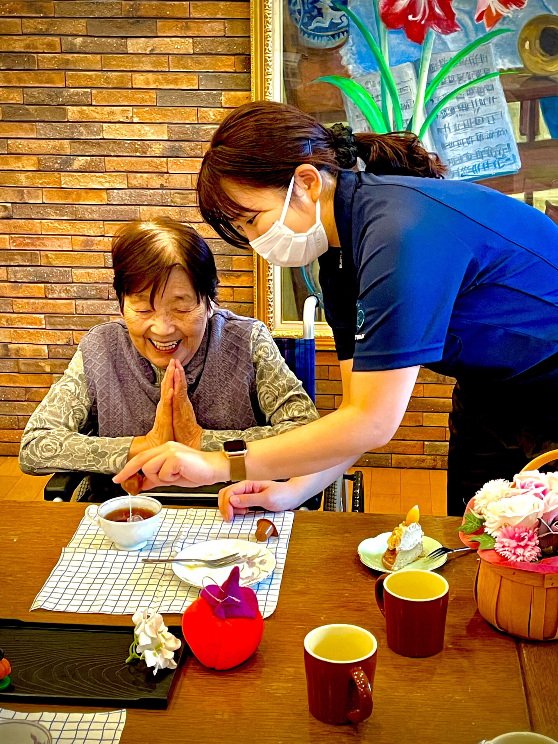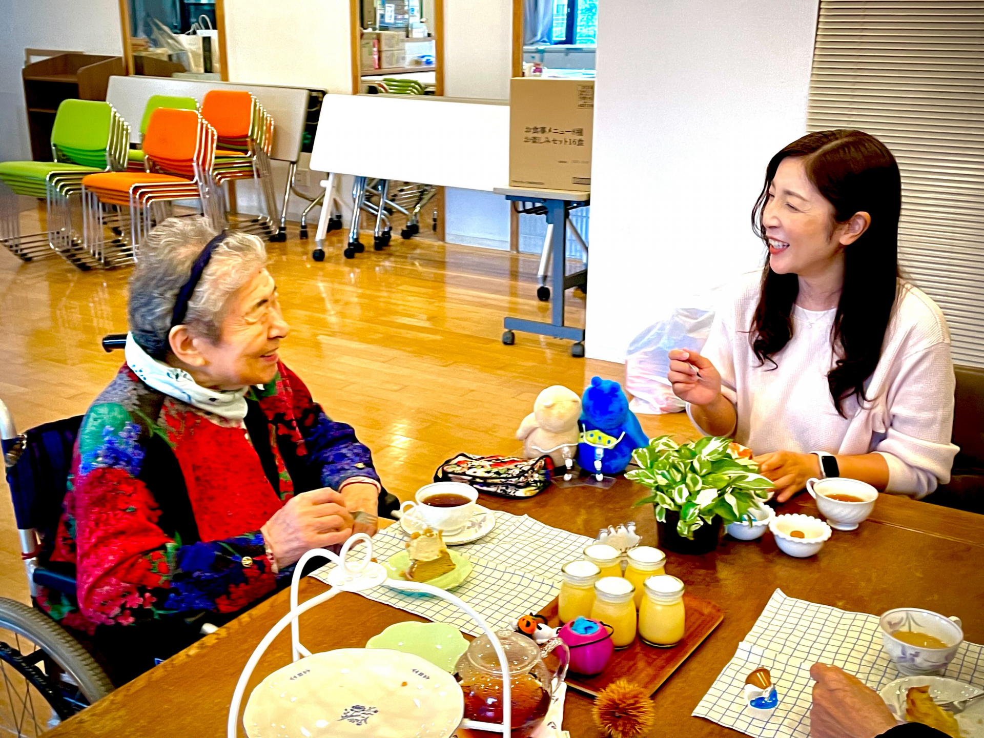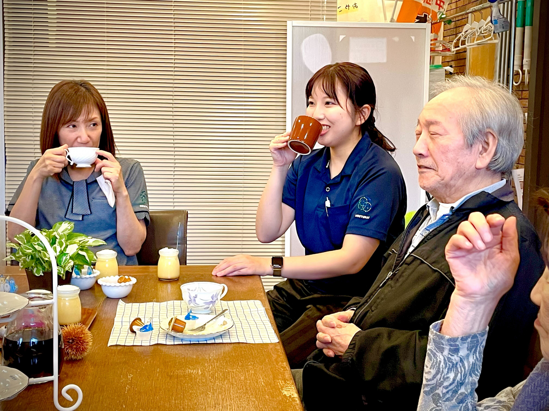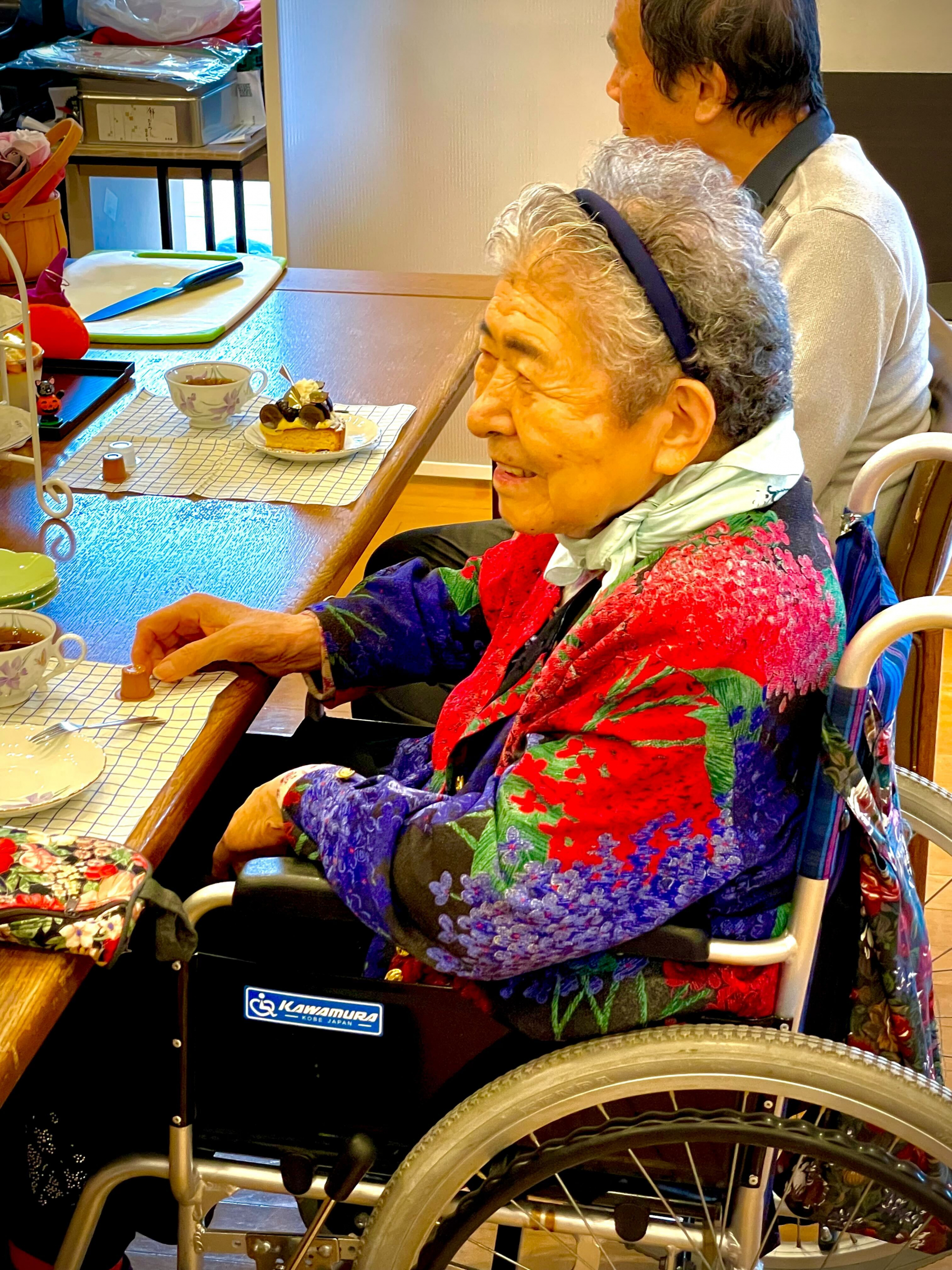 また、奉優の家 茶話会の特徴でもある「職員参加型」にすることで利用者と職員という関係を超え、まるで本当に家族や友人とティーパーティーをしているかのような穏やかで和やかな雰囲気づくりを行うことができます。こうした関係性の変化は、ご利用者様の安心感や満足感を得ることができると感じました。